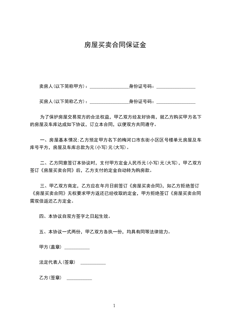 一、房屋基本情况;乙方预定甲方名下的梅河口市东街小区区号楼单元房屋及车库号平方,房屋及车库总款为_____元(小写)元(大写)。