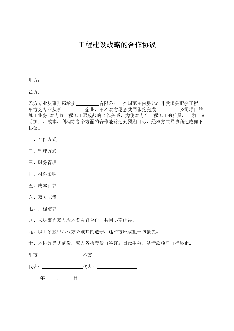 甲方:_________________ 乙方:_________________ 乙方专业从事开拓承接__________有限公司,全国范围内房地产开发相关配套工程,甲方为专业从事__________企业,甲乙双方愿意共同承接完成__________公司项目的施工业务;双方就工程施工形成战略合作关系,为使双方在工程施工的质量、工期、文明施工、成本,利润等各个方面的合作能够达到预期目标,经双方共同协商达成如下协议。 一、合作方式 二、管理方式 三、财务管理 四、材料采购 五、成本计算 六、双方职责 七、工程结算 八、未尽事宜双方应本着友好合作,共同协商解决。 九、以上条款甲乙双方必须共同遵守,违约方应承担一切损失。 十、本协议壹式贰份,双方各执壹份自签订即日起生效,结清款项后自行终止。 甲方:_________________乙方:_________________ 代表:_________________代表:_________________ _____年_____月_____日
