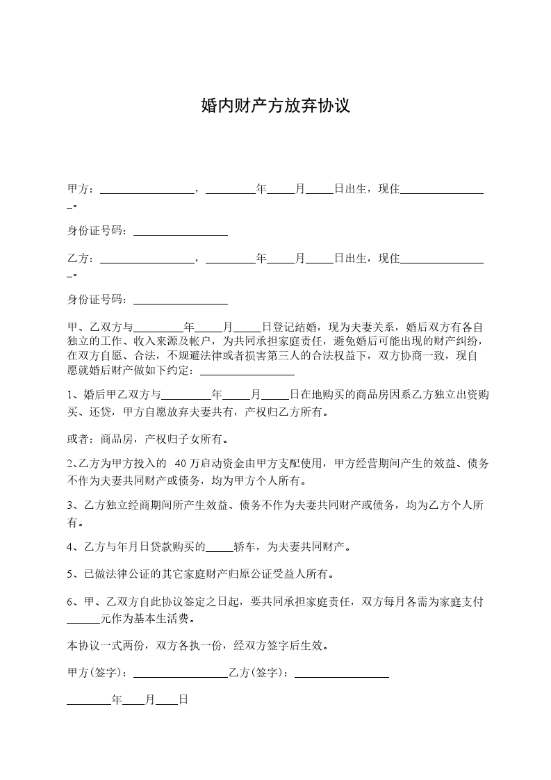 甲方:_________________,_________年_____月_____日出生,现住________________。 身份证号码:_________________ 乙方:_________________,_________年_____月_____日出生,现住________________。 身份证号码:_________________ 甲、乙双方与_________年_____月_____日登记结婚,现为夫妻关系,婚后双方有各自独立的工作、收入来源及账户,为共同承担家庭责任,避免婚后可能出现的财产纠纷,在双方自愿、合法,不规避法律或者损害第三人的合法权益下,双方协商一致,现自愿就婚后财产做如下约定:_________________ 1、婚后甲乙双方与_________年_____月_____日在地购买的商品房因系乙方独立出资购买、还贷,甲方自愿放弃夫妻共有,产权归乙方所有。 或者:商品房,产权归子女所有。 2、乙方为甲方投入的40万启动资金由甲方支配使用,甲方经营期间产生的效益、债务不作为夫妻共同财产或债务,均为甲方个人所有。 3、乙方独立经商期间所产生效益、债务不作为夫妻共同财产或债务,均为乙方个人所有。 4、乙方与_____年_____月_____日贷款购买的_____轿车,为夫妻共同财产。 5、已做法律公证的其它家庭财产归原公证受益人所有。 6、甲、乙双方自此协议签定之日起,要共同承担家庭责任,双方每月各需为家庭支付______元作为基本生活费。 本协议一式两份,双方各执一份,经双方签字后生效。 甲方(签字):_________________乙方(签字):_________________ ________年____月____日