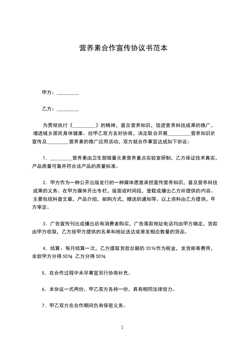 为贯彻执行《_________》的精神,普及营养知识,促进营养科技成果的推广,增进城乡居民身体健康。经甲乙双方友好协商,决定联合开展_________营养知识的宣传及_________营养素的推广应用活动,双方就合作事宜达成如下协议: