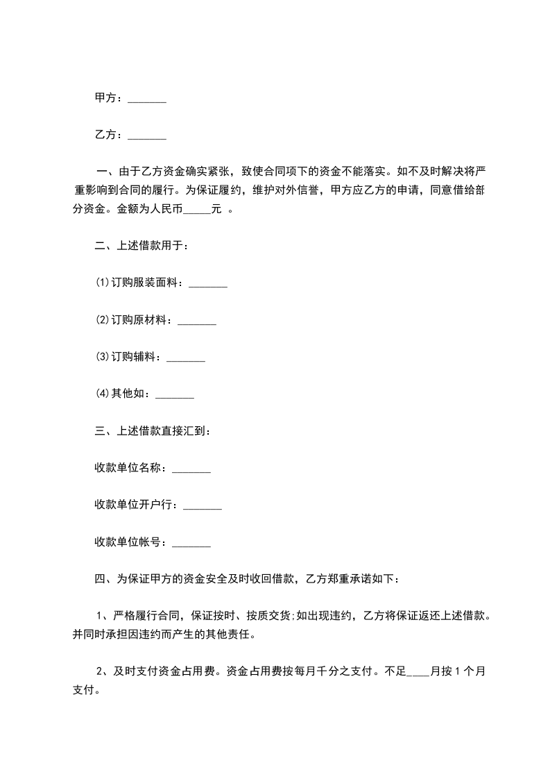 一、由于乙方资金紧张,周转困难,致使本身生产停泄,已签订合同项目不能按期完工,如不及时解决将严重影响到合同的履行。为保证履约,维护对外信誉,乙方向甲方商议借款人民币_____元以便购入材料进行生产。甲方应乙方申请,同意借给乙方资金人民币_____元。