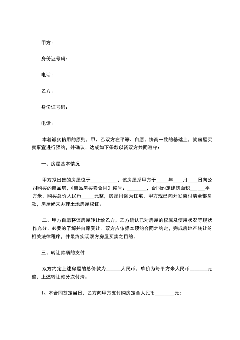 2。本合同书签订时,甲方向乙方交付房屋选房房号________号、房屋购买押金条、甲方已垫付预付房款________万圆整的发票以及其他相关票据。乙方向甲方支付房号费用和甲方已经垫付的.购房款拾万圆整,共计万圆整。乙方对上述房号和此后乙方所选房子具有所有权和使用权。此后,买卖上述房产交易过程中产生的一切费用,均由乙方承担缴纳,甲方不承担任何费用。