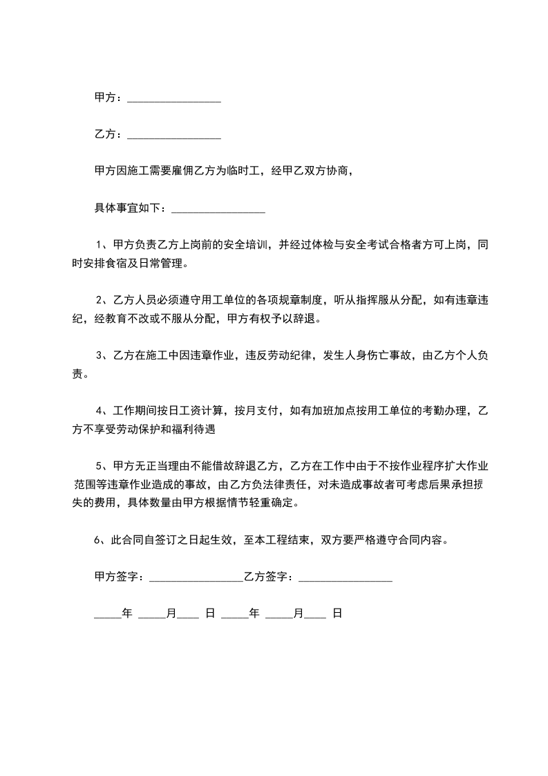 甲方因施工需要雇佣乙方为临时工,经甲乙双方协商,