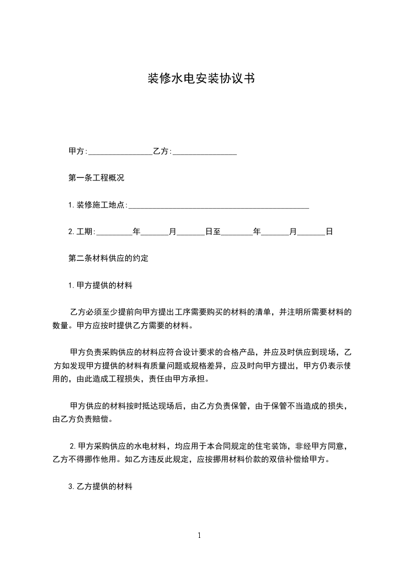 甲、乙双方在平等、自愿、协商一致的基础上,本着相互信任的原则,就甲方的水电工程达成以下协议。
