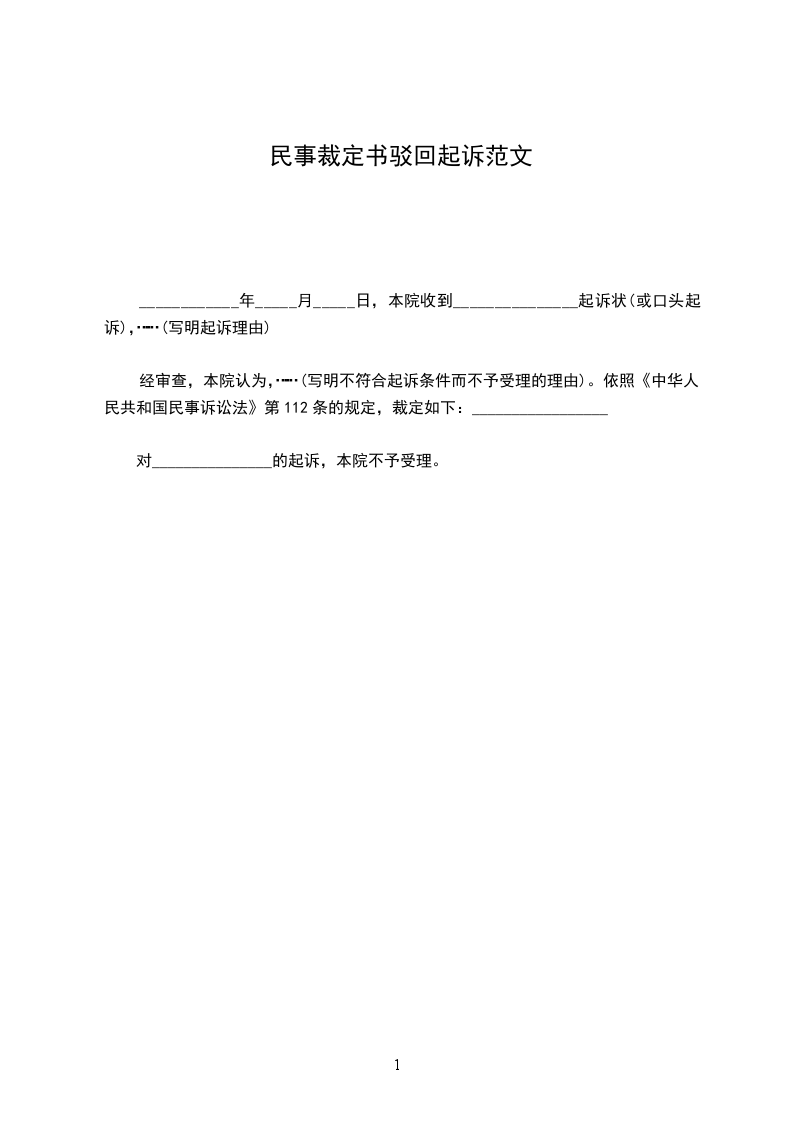 经审查,本院认为,……(写明不符合起诉条件而不予受理的理由)。依照《中华人民共和国民事诉讼法》第112条的规定,裁定如下:_________________