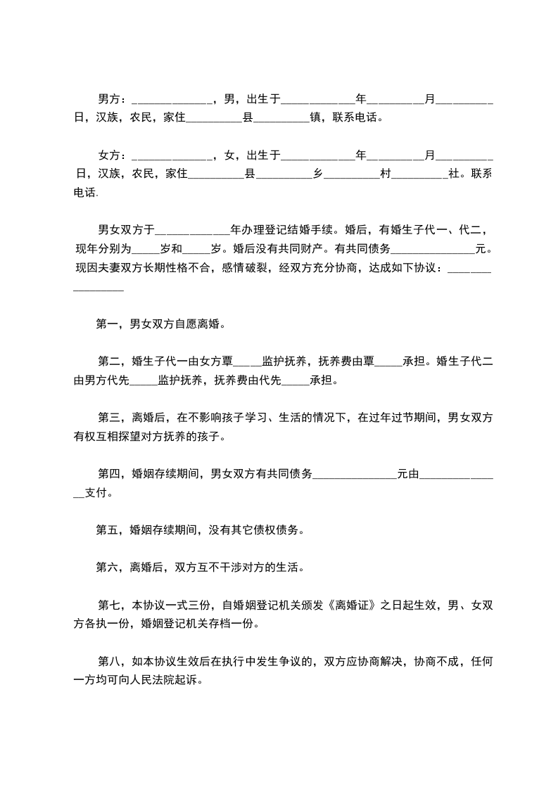 吴__________与林__________于_____________年_____月_____日经恋爱结婚,婚后感情尚好,生有一子吴_____。因近一年来林__________沉溺于麻将,经常整夜不归,不尽照顾家庭和儿子的义务。为此经常发生争吵,矛盾日益激化,夫妻感情受到极大伤害,经居委会、亲戚朋友劝解无效,双方都认为无法共同生活下去,故协议离婚如下:_________________
