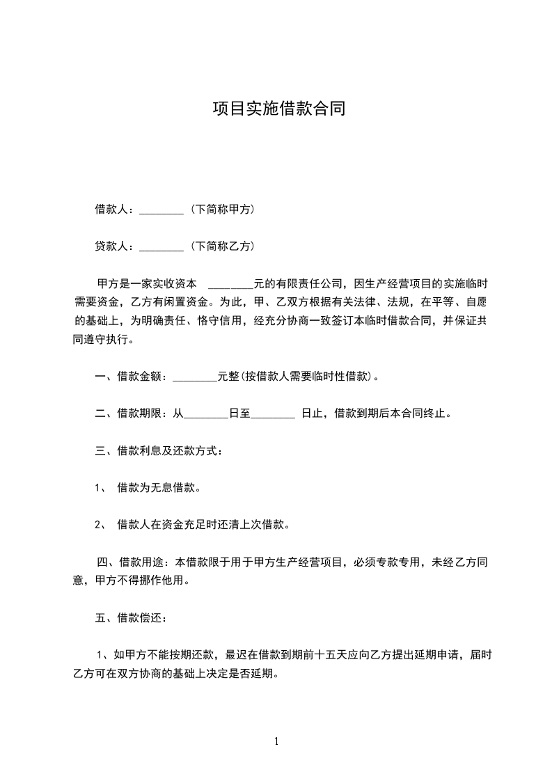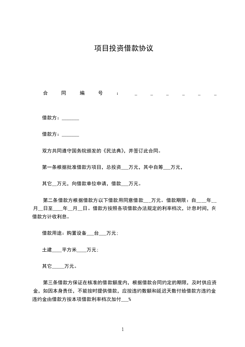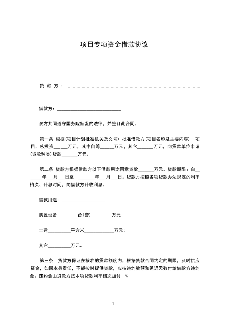 第一条根据________(项目计划批准机关及文号)批准借款方(项目名称及主要内容)________项目,总投资________万元,其中自筹____万元,其他____万元,向贷款单位申请(贷款种类)____贷款____万元。