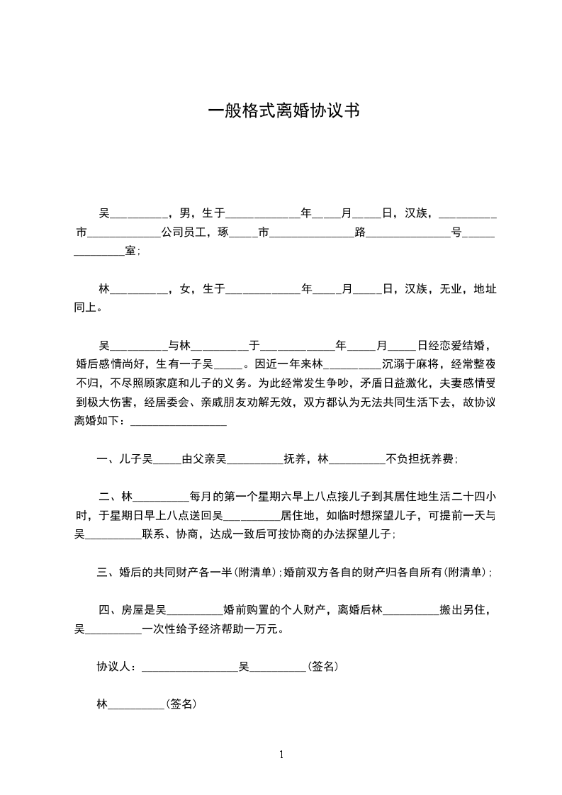 吴__________与林__________于_____________年_____月_____日经恋爱结婚,婚后感情尚好,生有一子吴_____。因近一年来林__________沉溺于麻将,经常整夜不归,不尽照顾家庭和儿子的义务。为此经常发生争吵,矛盾日益激化,夫妻感情受到极大伤害,经居委会、亲戚朋友劝解无效,双方都认为无法共同生活下去,故协议离婚如下:_________________