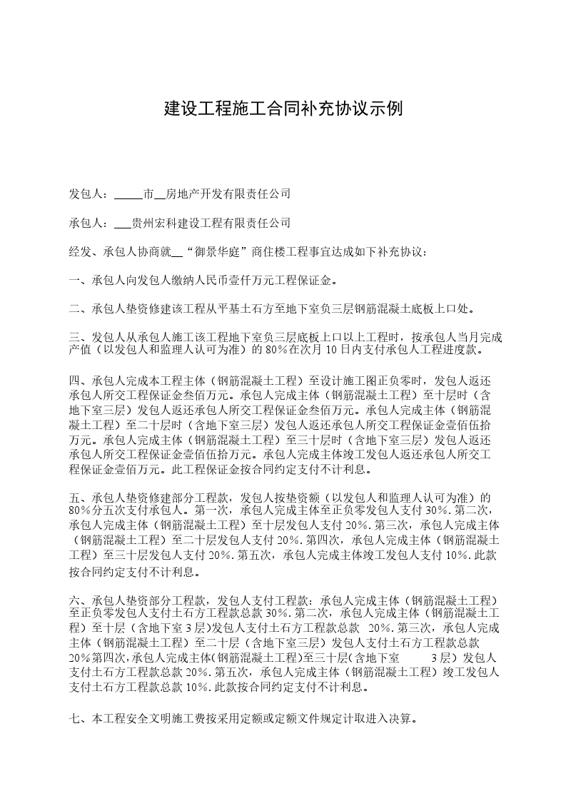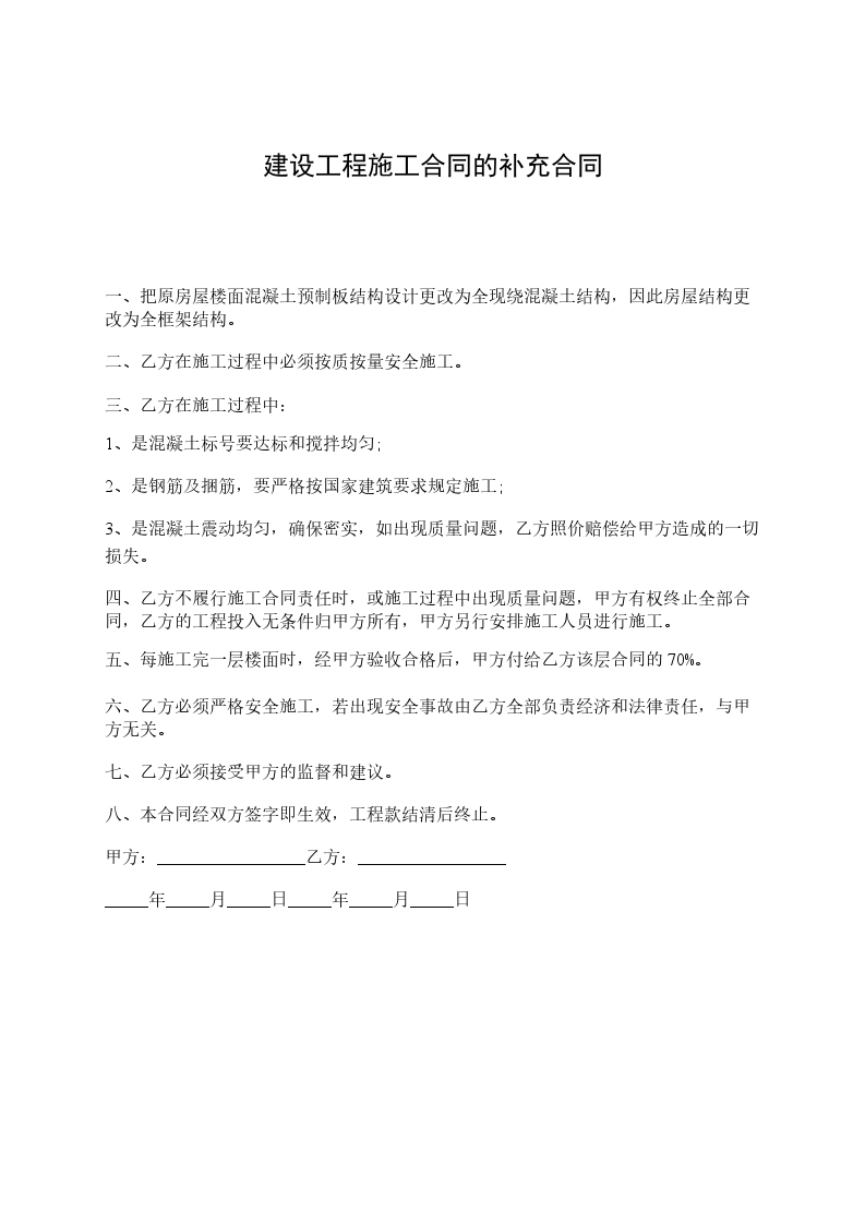 一、把原房屋楼面混凝土预制板结构设计更改为全现绕混凝土结构,因此房屋结构更改为全框架结构。 二、乙方在施工过程中必须按质按量安全施工。 三、乙方在施工过程中: 1、是混凝土标号要达标和搅拌均匀; 2、是钢筋及捆筋,要严格按国家建筑要求规定施工; 3、是混凝土震动均匀,确保密实,如出现质量问题,乙方照价赔偿给甲方造成的一切损失。 四、乙方不履行施工合同责任时,或施工过程中出现质量问题,甲方有权终止全部合同,乙方的工程投入无条件归甲方所有,甲方另行安排施工人员进行施工。 五、每施工完一层楼面时,经甲方验收合格后,甲方付给乙方该层合同的70%。 六、乙方必须严格安全施工,若出现安全事故由乙方全部负责经济和法律责任,与甲方无关。 七、乙方必须接受甲方的监督和建议。 八、本合同经双方签字即生效,工程款结清后终止。 甲方:_________________乙方:_________________ _____年_____月_____日_____年_____月_____日
