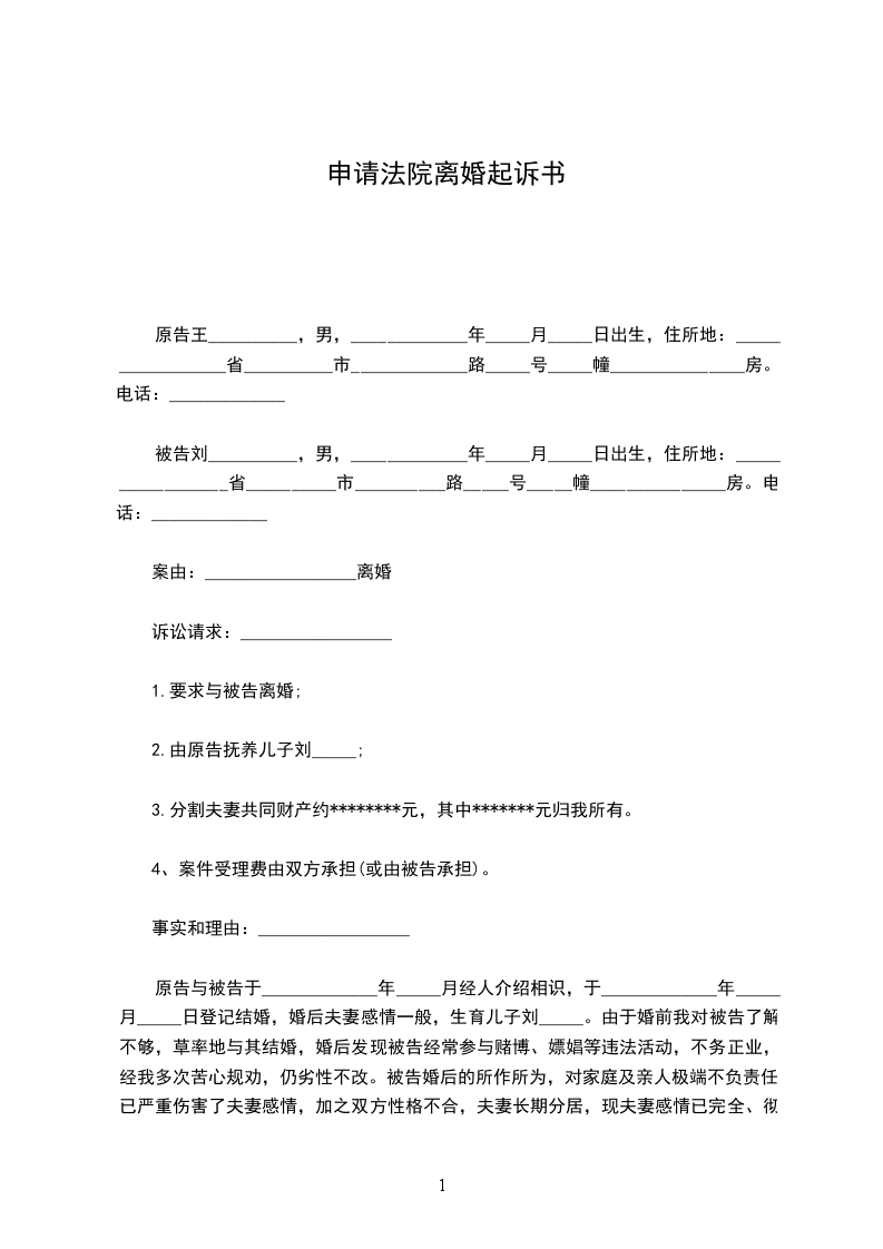 原告与被告于_____________年_____月经人介绍相识,于_____________年_____月_____日登记结婚,婚后夫妻感情一般,生育儿子刘_____。由于婚前我对被告了解不够,草率地与其结婚,婚后发现被告经常参与赌博、嫖娼等违法活动,不务正业,经我多次苦心规劝,仍劣性不改。被告婚后的所作所为,对家庭及亲人极端不负责任,已严重伤害了夫妻感情,加之双方性格不合,夫妻长期分居,现夫妻感情已完全、彻底破裂,夫妻关系名存实亡。另我们夫妻存续期间拥有夫妻共同财产约*******元。现我向法院提起诉讼,要求与被告离婚并由我抚养儿子刘_____,另分割夫妻共同财产*******元中的*******元归我所有。