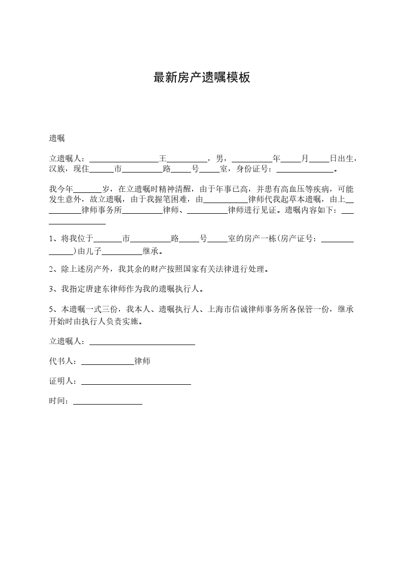 遗嘱 立遗嘱人:_________________王__________,男,__________年_____月_____日出生,汉族,现住______市__________路_____号_____室,身份证号:______________。 我今年_______岁,在立遗嘱时精神清醒,由于年事已高,并患有高血压等疾病,可能发生意外,故立遗嘱,由于我握笔困难,由___________律师代我起草本遗嘱,由上__________律师事务所__________律师、__________律师进行见证。遗嘱内容如下:_________________ 1、将我位于_______市__________路_____号_____室的房产一栋(房产证号:______________)由儿子__________继承。 2、除上述房产外,我其余的财产按照国家有关法律进行处理。 3、我指定唐建东律师作为我的遗嘱执行人。 5、本遗嘱一式三份,我本人、遗嘱执行人、上海市信诚律师事务所各保管一份,继承开始时由执行人负责实施。 立遗嘱人:__________________________ 代书人:_____________律师 证明人:___________________________ 时间:_________________