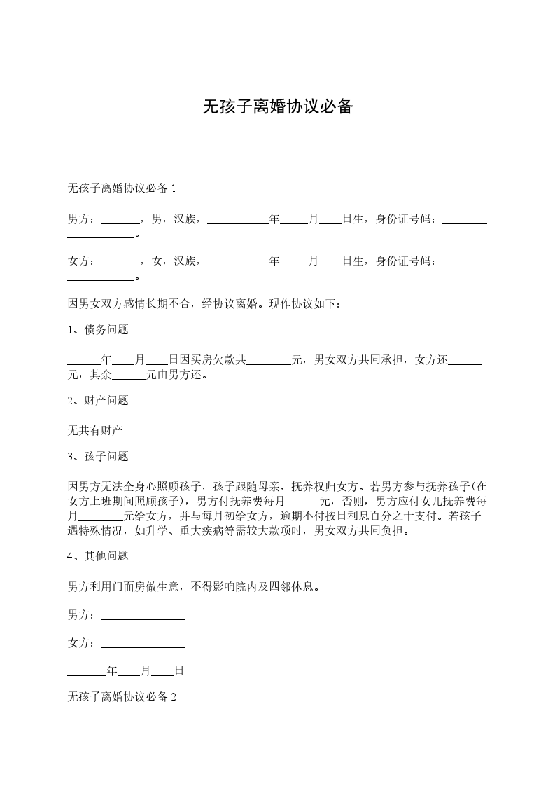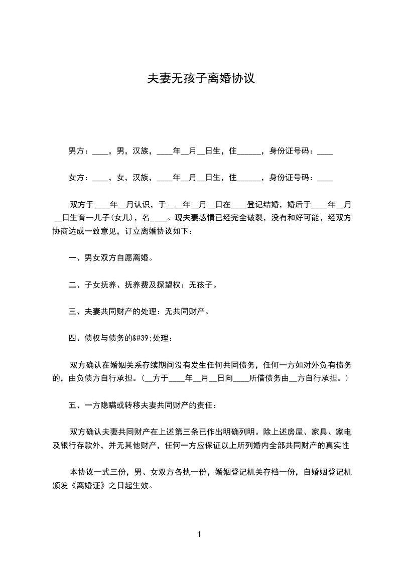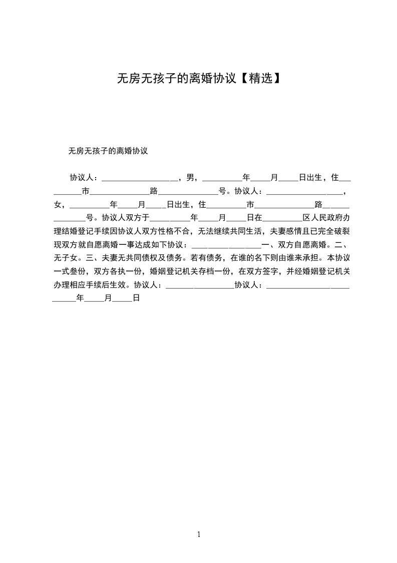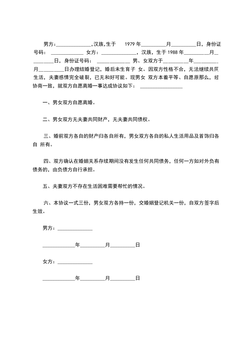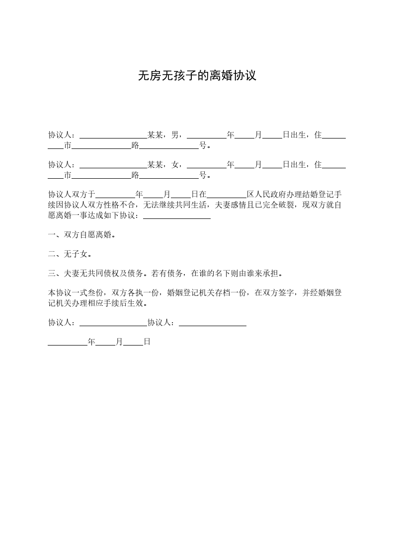 协议人:_________________某某,男,__________年_____月_____日出生,住__________市_______________路_______________号。 协议人:_________________某某,女,__________年_____月_____日出生,住__________市_______________路_______________号。 协议人双方于__________年_____月_____日在__________区人民政府办理结婚登记手续因协议人双方性格不合,无法继续共同生活,夫妻感情且已完全破裂,现双方就自愿离婚一事达成如下协议:_________________ 一、双方自愿离婚。 二、无子女。 三、夫妻无共同债权及债务。若有债务,在谁的名下则由谁来承担。 本协议一式叁份,双方各执一份,婚姻登记机关存档一份,在双方签字,并经婚姻登记机关办理相应手续后生效。 协议人:_________________协议人:_________________ __________年_____月_____日