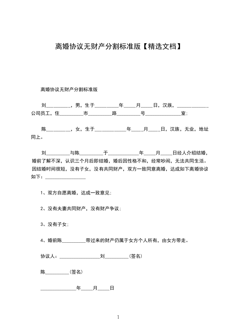 刘__________与陈__________于_____________年_____月_____日经人介绍结婚,婚前了解不深,认识三个月后即结婚,婚后因性格不和,经常吵闹,无法共同生活。因结婚时间很短,没有子女,没有共同财产,双方一致同意离婚,达成如下离婚协议如下:_________________