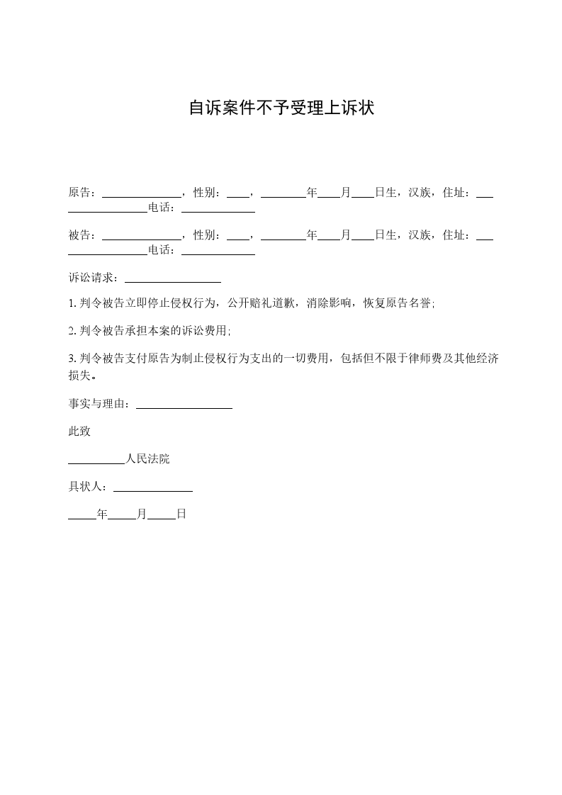 原告:______________,性别:____,________年____月____日生,汉族,住址:_________________电话:_____________ 被告:______________,性别:____,________年____月____日生,汉族,住址:_________________电话:_____________ 诉讼请求:_________________ 1.判令被告立即停止侵权行为,公开赔礼道歉,消除影响,恢复原告名誉; 2.判令被告承担本案的诉讼费用; 3.判令被告支付原告为制止侵权行为支出的一切费用,包括但不限于律师费及其他经济损失。 事实与理由:_________________ 此致 __________人民法院 具状人:______________ _____年_____月_____日