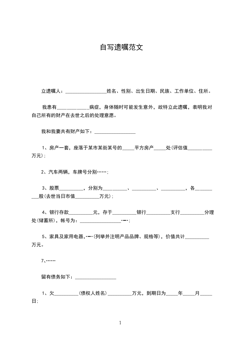 我患有_____________病症,身体随时可能发生意外,故特立此遗嘱,表明我对自己所有的财产在去世之后的处理意愿。