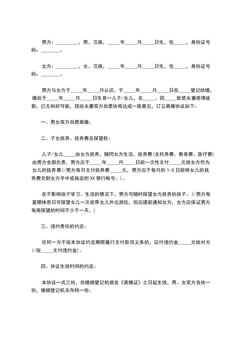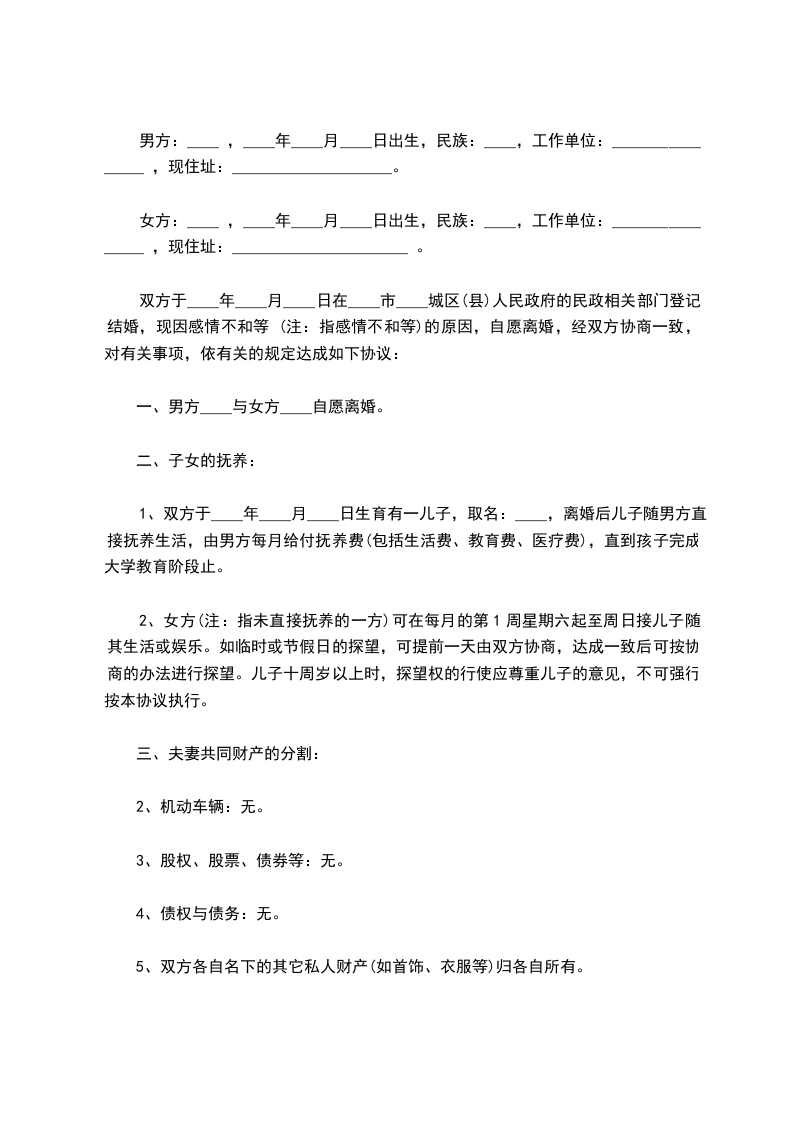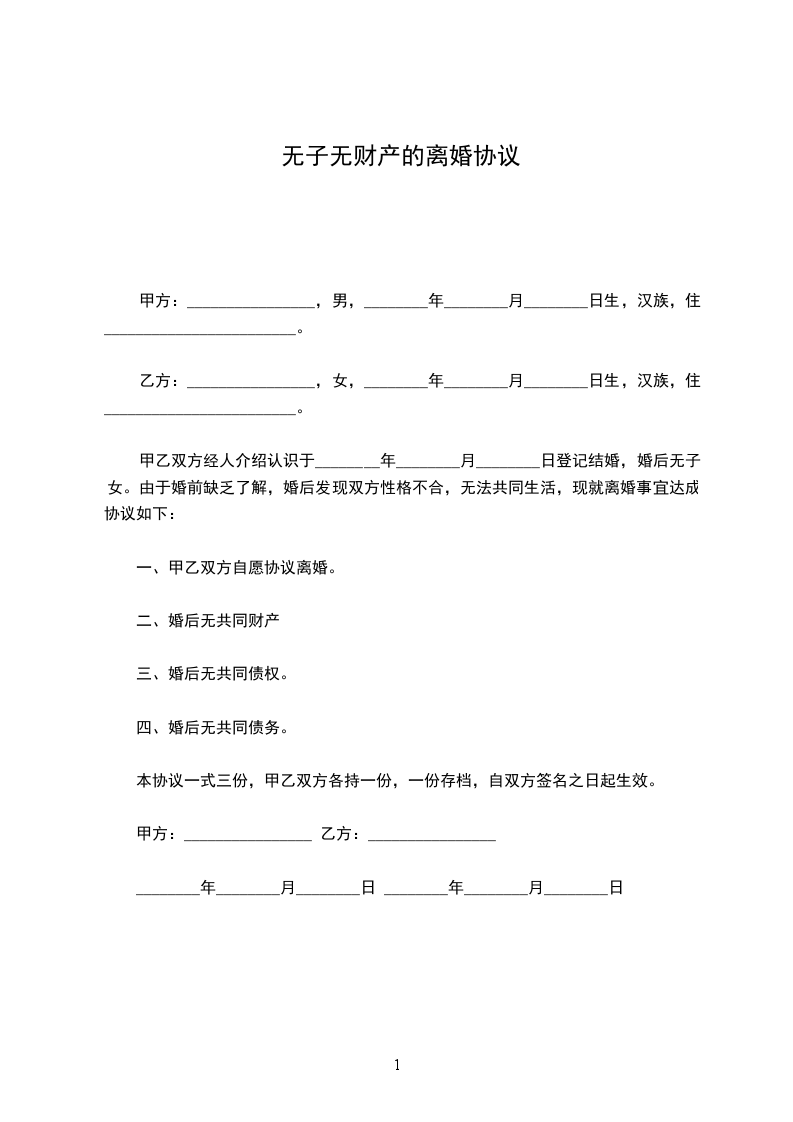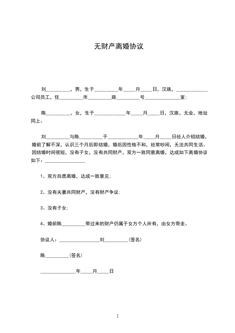 刘__________与陈__________于_____________年_____月_____日经人介绍结婚,婚前了解不深,认识三个月后即结婚,婚后因性格不和,经常吵闹,无法共同生活。因结婚时间很短,没有子女,没有共同财产,双方一致同意离婚,达成如下离婚协议如下:_________________