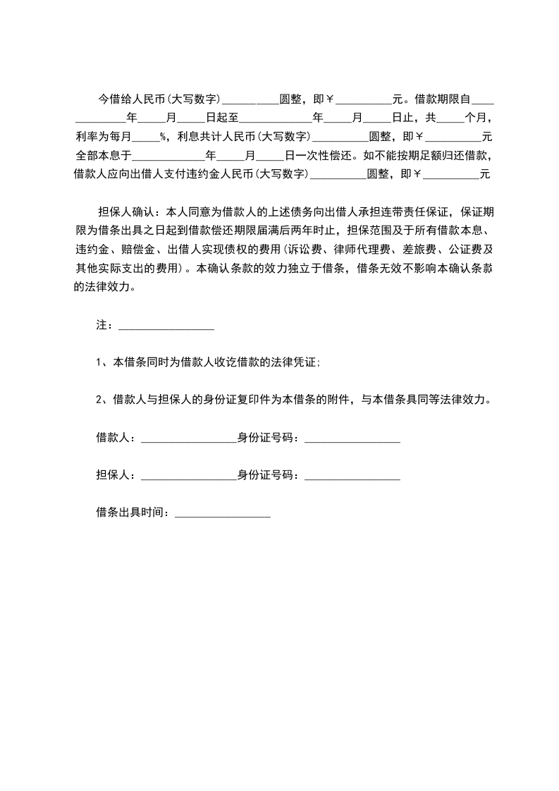 今借给人民币(大写数字)__________圆整,即¥__________元。借款期限自_____________年_____月_____日起至_____________年_____月_____日止,共_____个月,利率为每月_____%,利息共计人民币(大写数字)__________圆整,即¥__________元,全部本息于_____________年_____月_____日一次性偿还。如不能按期足额归还借款,借款人应向出借人支付违约金人民币(大写数字)__________圆整,即¥__________元。