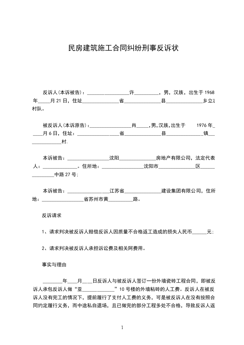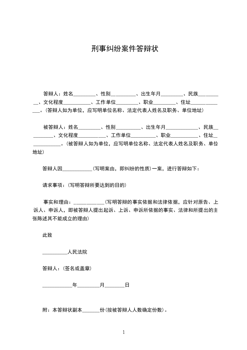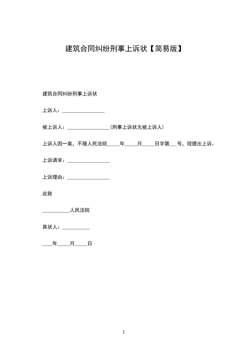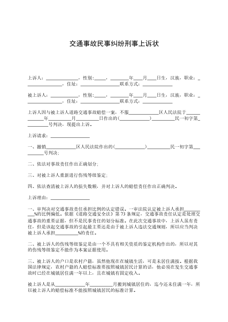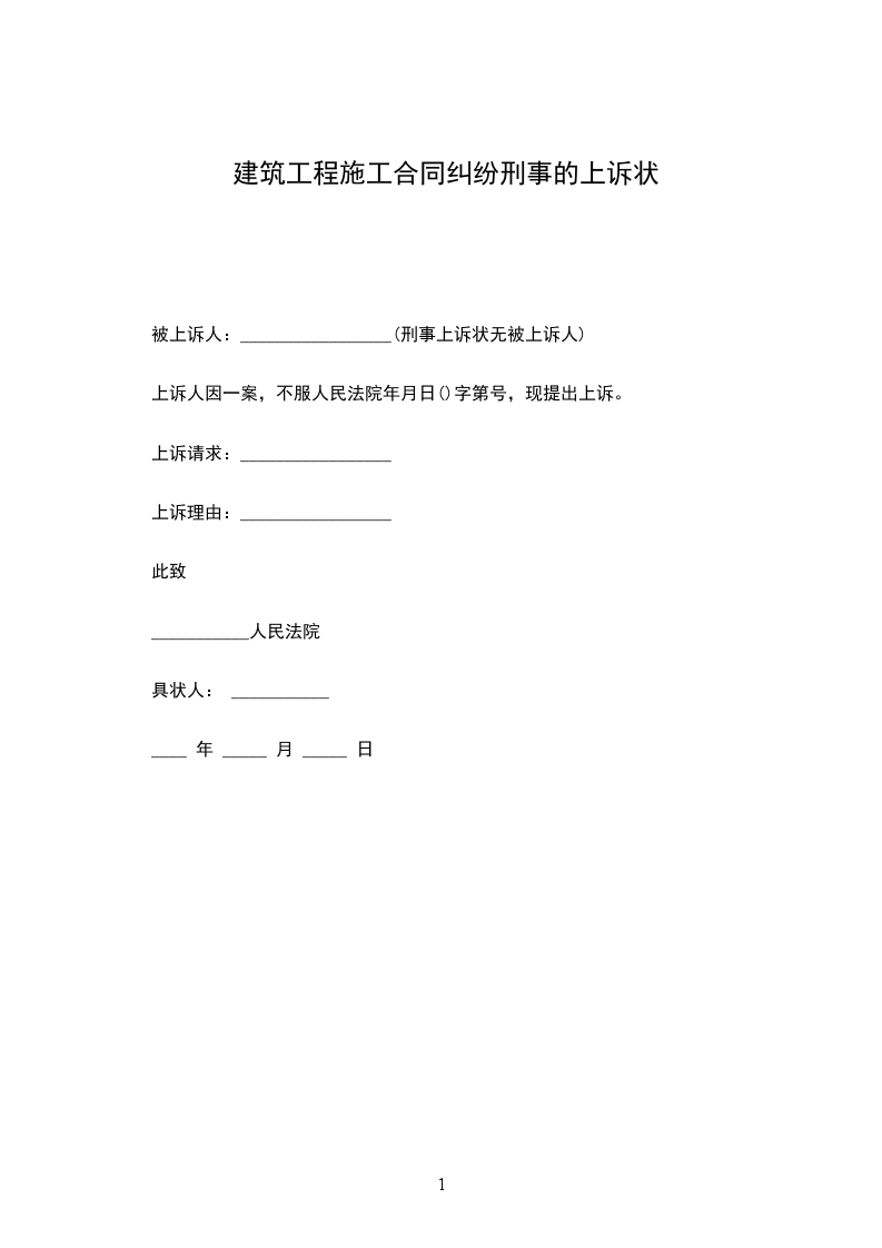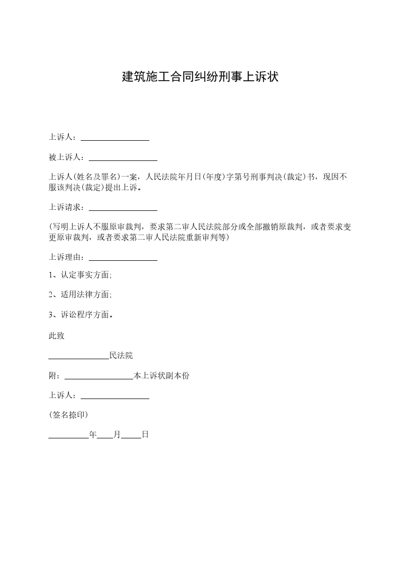 上诉人:_________________ 被上诉人:_________________ 上诉人(姓名及罪名)一案,人民法院_____年_____月_____日(年度)字第号刑事判决(裁定)书,现因不服该判决(裁定)提出上诉。 上诉请求:_________________ (写明上诉人不服原审裁判,要求第二审人民法院部分或全部撤销原裁判,或者要求变更原审裁判,或者要求第二审人民法院重新审判等) 上诉理由:_________________ 1、认定事实方面; 2、适用法律方面; 3、诉讼程序方面。 此致 _______________民法院 附:_________________本上诉状副本份 上诉人:_________________ (签名捺印) __________年____月_____日