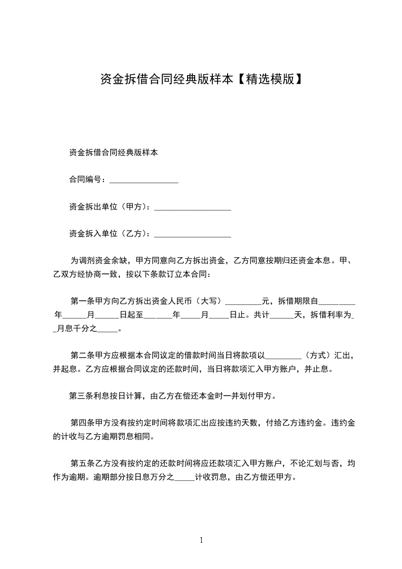 第一条?甲方向乙方拆出资金人民币(大写)_________元,拆借期限自_________年______月______日起至_______年_____月_____日止。共计______天,拆借利率为月息千分之_____。