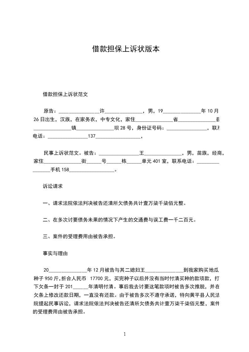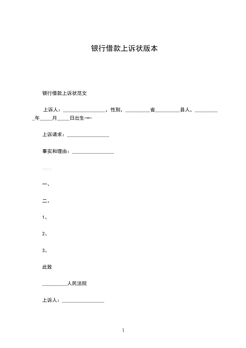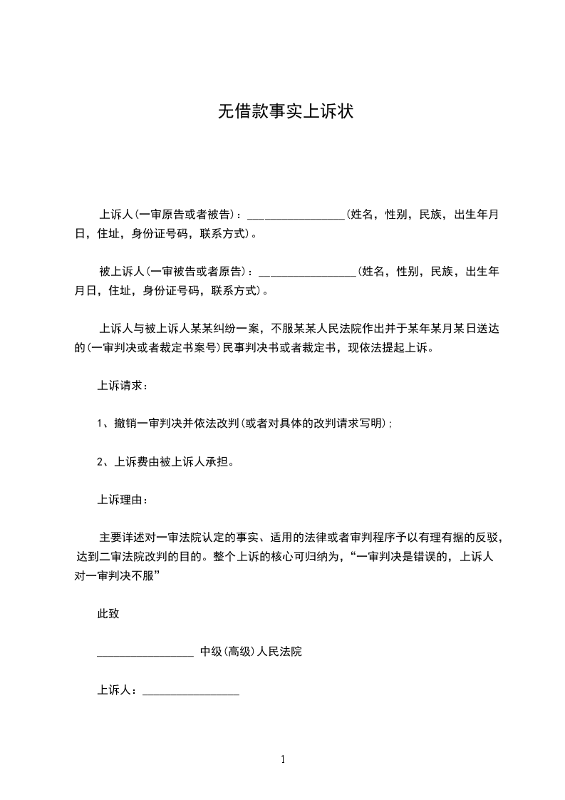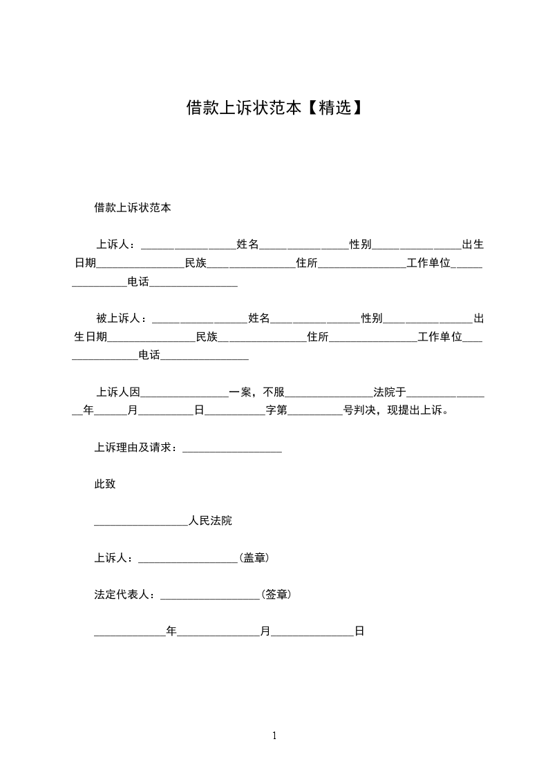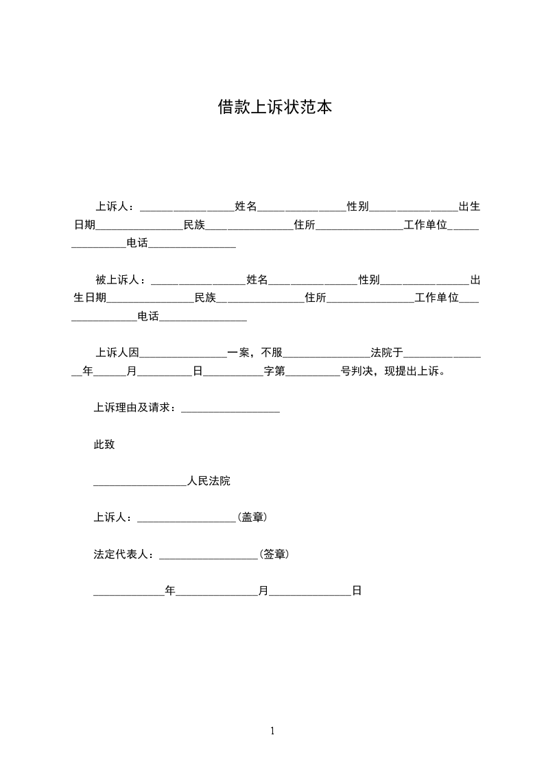 上诉人:_________________姓名________________性别________________出生日期________________民族________________住所________________工作单位________________电话________________