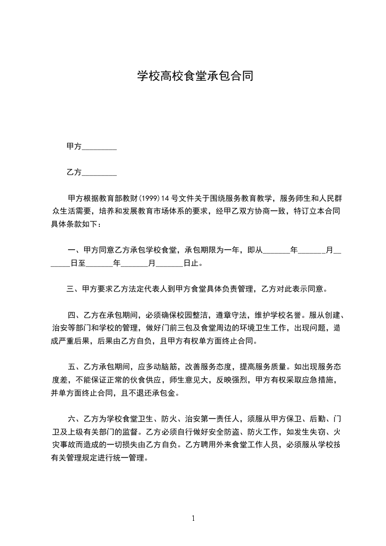 一、甲方同意乙方承包学校食堂,承包期限为一年,即从_______年_______月_______日至_______年_______月_______日止。