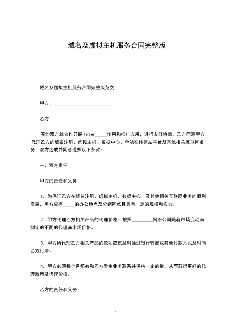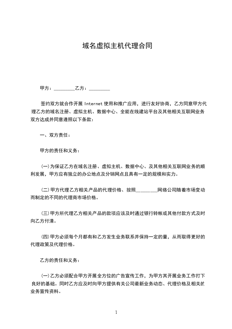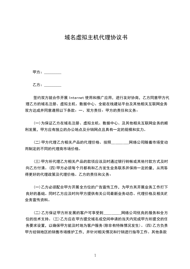 乙方作为提供域名注册及虚拟主机信息平台租用服务的提供商,甲方作为乙方该项业务的代理商,双方本着互惠互利并在遵守国家有关政策和法规的基础上,签定以下合同: