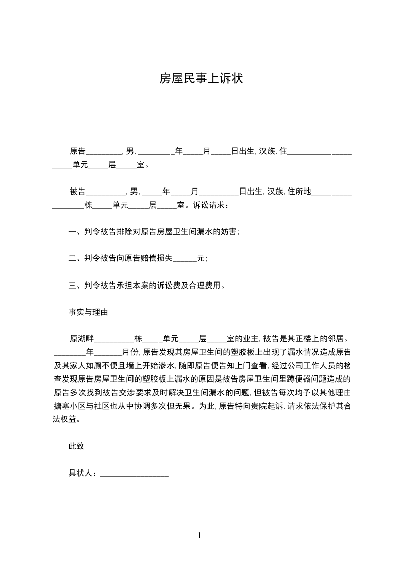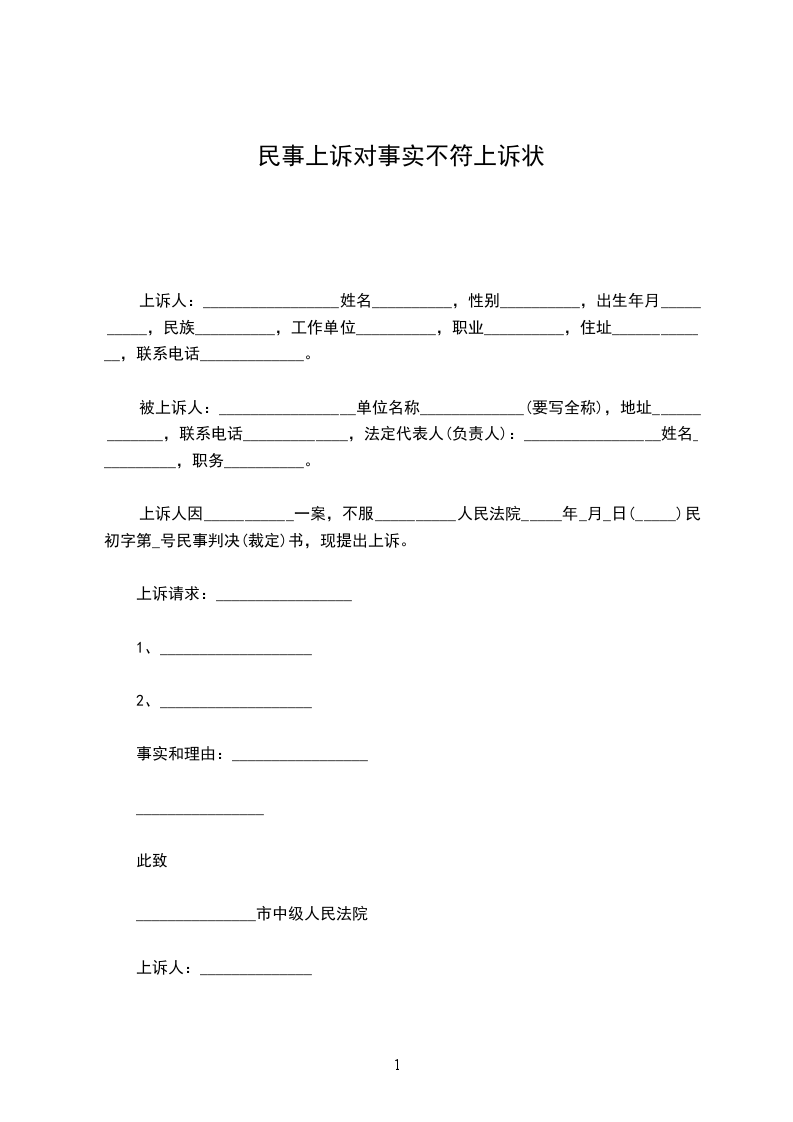 上诉人:_________________姓名__________,性别__________,出生年月__________,民族__________,工作单位__________,职业__________,住址_____________,联系电话_____________。
