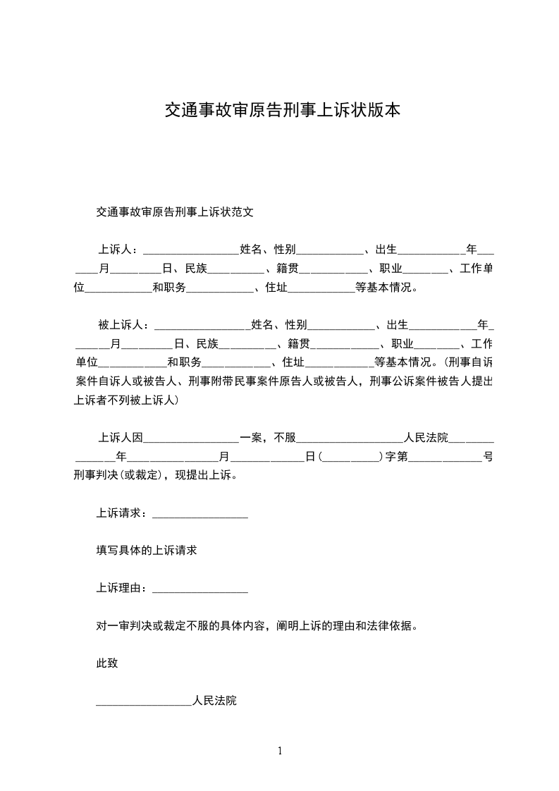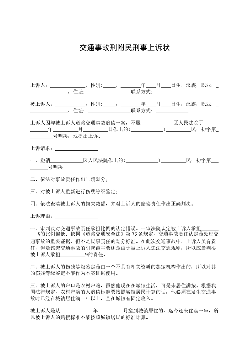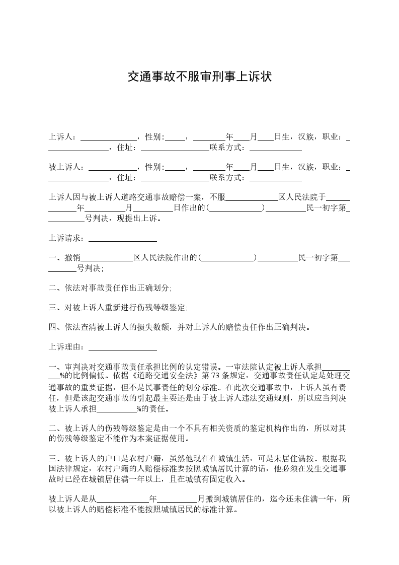 上诉人:______________,性别:_____,________年____月____日生,汉族,职业:________________,住址:_________________联系方式:_____________ 被上诉人:____________,性别:_____,________年____月____日生,汉族,职业:________________,住址:_________________联系方式:_____________ 上诉人因与被上诉人道路交通事故赔偿一案,不服_____________区人民法院于_____________年__________月__________日作出的(_____________)__________民一初字第__________号判决,现提出上诉。 上诉请求:_________________ 一、撤销_____________区人民法院作出的(_____________)__________民一初字第__________号判决; 二、依法对事故责任作出正确划分; 三、对被上诉人重新进行伤残等级鉴定; 四、依法查清被上诉人的损失数额,并对上诉人的赔偿责任作出正确判决。 上诉理由:_________________ 一、审判决对交通事故责任承担比例的认定错误。一审法院认定被上诉人承担__________%的比例偏低。依据《道路交通安全法》第73条规定,交通事故责任认定是处理交通事故的重要证据,但不是民事责任的划分标准。在此次交通事故中,上诉人虽有责任,但是该起交通事故的引起最主要还是由于被上诉人违法交通规则,所以应当判决被上诉人承担__________%的责任。 二、被上诉人的伤残等级鉴定是由一个不具有相关资质的鉴定机构作出的,所以对其的伤残等级鉴定不能作为本案证据使用。 三、被上诉人的户口是农村户籍,虽然他现在在城镇生活,可是未居住满按。根据我国法律规定,农村户籍的人赔偿标准要按照城镇居民计算的话,他必须在发生交通事故时已经在城镇居住满一年以上,且在城镇有固定收入。 被上诉人是从_____________年__________月搬到城镇居住的,迄今还未住满一年,所以被上诉人的赔偿标准不能按照城镇居民的标准计算。 综上所述,__________法院第一审没有查明案件事实,结果显失公平,请求二审法院给予一个公正、合理的判决。此致 __________市中级人民法院 上诉人:______________ 20__________年__________月__________日