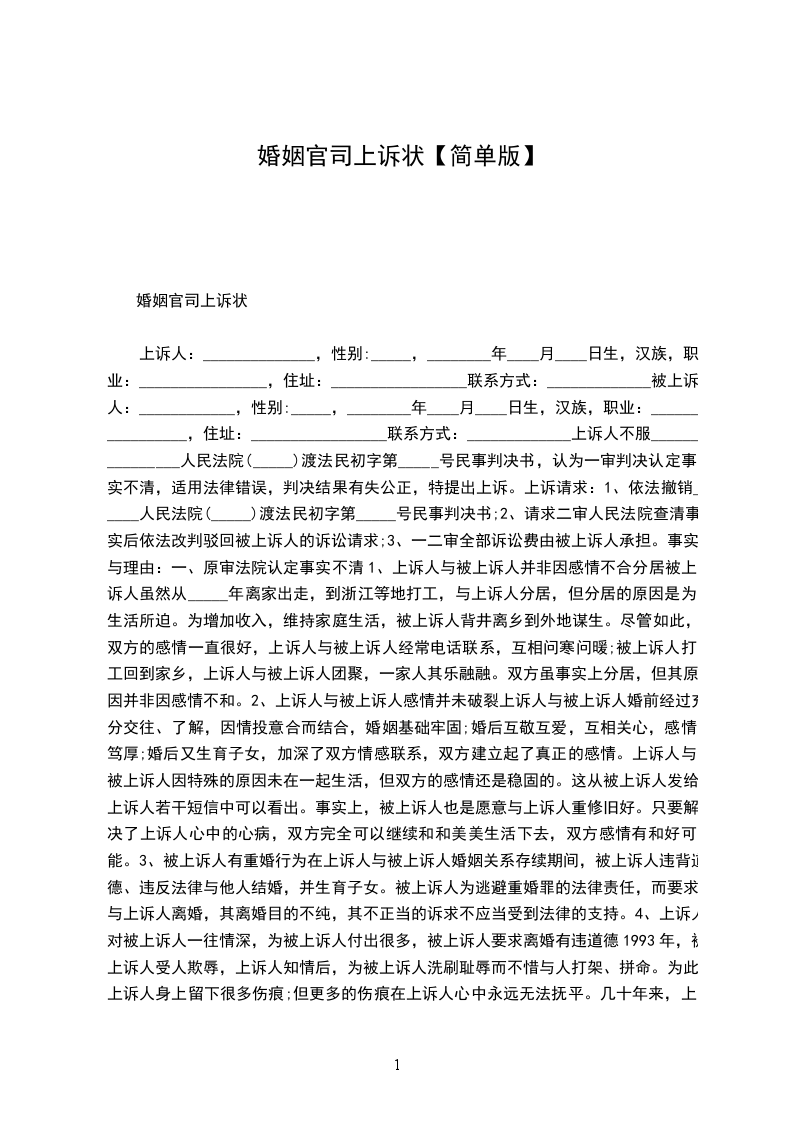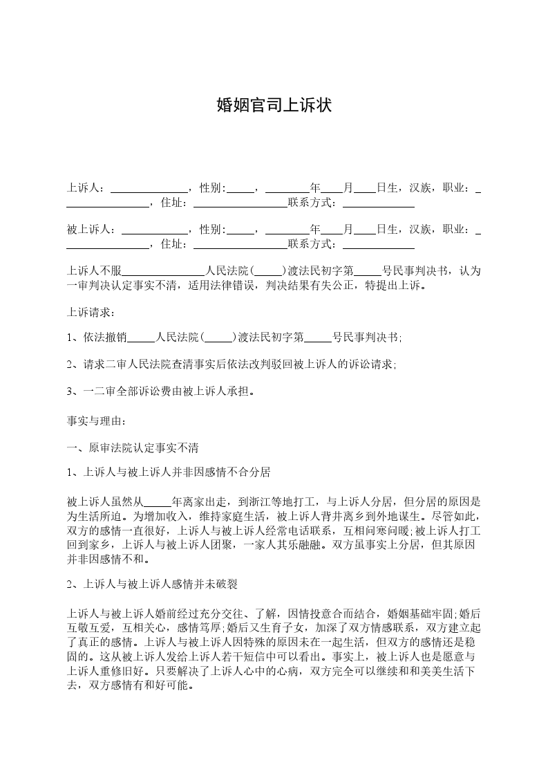 上诉人:______________,性别:_____,________年____月____日生,汉族,职业:________________,住址:_________________联系方式:_____________ 被上诉人:____________,性别:_____,________年____月____日生,汉族,职业:________________,住址:_________________联系方式:_____________ 上诉人不服_______________人民法院(_____)渡法民初字第_____号民事判决书,认为一审判决认定事实不清,适用法律错误,判决结果有失公正,特提出上诉。 上诉请求: 1、依法撤销_____人民法院(_____)渡法民初字第_____号民事判决书; 2、请求二审人民法院查清事实后依法改判驳回被上诉人的诉讼请求; 3、一二审全部诉讼费由被上诉人承担。 事实与理由: 一、原审法院认定事实不清 1、上诉人与被上诉人并非因感情不合分居 被上诉人虽然从_____年离家出走,到浙江等地打工,与上诉人分居,但分居的原因是为生活所迫。为增加收入,维持家庭生活,被上诉人背井离乡到外地谋生。尽管如此,双方的感情一直很好,上诉人与被上诉人经常电话联系,互相问寒问暖;被上诉人打工回到家乡,上诉人与被上诉人团聚,一家人其乐融融。双方虽事实上分居,但其原因并非因感情不和。 2、上诉人与被上诉人感情并未破裂 上诉人与被上诉人婚前经过充分交往、了解,因情投意合而结合,婚姻基础牢固;婚后互敬互爱,互相关心,感情笃厚;婚后又生育子女,加深了双方情感联系,双方建立起了真正的感情。上诉人与被上诉人因特殊的原因未在一起生活,但双方的感情还是稳固的。这从被上诉人发给上诉人若干短信中可以看出。事实上,被上诉人也是愿意与上诉人重修旧好。只要解决了上诉人心中的心病,双方完全可以继续和和美美生活下去,双方感情有和好可能。 3、被上诉人有重婚行为 在上诉人与被上诉人婚姻关系存续期间,被上诉人违背道德、违反法律与他人结婚,并生育子女。被上诉人为逃避重婚罪的法律责任,而要求与上诉人离婚,其离婚目的不纯,其不正当的诉求不应当受到法律的支持。 4、上诉人对被上诉人一往情深,为被上诉人付出很多,被上诉人要求离婚有违道德 1993年,被上诉人受人欺辱,上诉人知情后,为被上诉人洗刷耻辱而不惜与人打架、拼命。为此,上诉人身上留下很多伤痕;但更多的伤痕在上诉人心中永远无法抚平。几十年来,上诉人一直生活在为被上诉人报仇雪恨的折磨中,痛苦不堪,正常生活尽毁;而被上诉人对此不理解,不感恩,反而提出离婚。其似有忘恩负义之嫌。鉴于法律有社会引导功能,对此不道德之举,法律似以否定评价为妥。 二、原审判决适用法律错误,判决结果有失公正。 1、原审法院适用《民法典》32条第四项之规定判决双方离婚系适用法律错误 《民法典》32条:“………(四)因感情不合分居满两年的。 前已述及,上诉人与被上诉人之间是因生活所迫而分居,并非因双方感情不和而分居。原审法院既然未查明双方感情不和的原因,径直机械适用该法条判决双方离婚,是为适用法律错误。 2、双方并非感情完全破裂,有和好的可能 前已述及,上诉人与被上诉人双方感情尚未完全破裂,有和好的可能。只要双方协商解决一些分歧,双方完全有可能重修旧好。此案不符合法律规定的`判决离婚的唯一原则:夫妻双方感情破裂。从社会和谐的政治高度出发,本案以判决双方不准许离婚为妥。 3、被上诉人有重大过错,法院不应该支持过错方 此案中,被上诉人的过错在于,其与上诉人婚姻关系存续期间与他人结婚。此为严重违背道德,严重违法乃至犯罪行为,其提出离婚目的不当。一审法院支持被上诉人之诉请,有纵容、鼓励被上诉人违反道德、违法犯罪之嫌疑,有违法律立法宗旨。法律的功能被异化成败坏社会风气、惩善扬恶之工具,是为法律与法律人的悲哀。 此案中,被上诉人的过错在于,其对上诉人的多年巨大付出不感恩,不理解,辜负上诉人的情意,自私自利,肆意伤害上诉人的感情。其行为不合道德,其诉求不应该得到主张。 综上,原审判决认定事实不清,适用法律错误,判决结果至为不公,应予撤销并查清事实后改判驳回被上诉人在一审中的诉讼请求。为维护上诉人的合法权益,故诉来你院,请法院支持上诉人的诉讼请求。 此致 __________中级人民法院 上诉人:__________ _____年_____月_____日