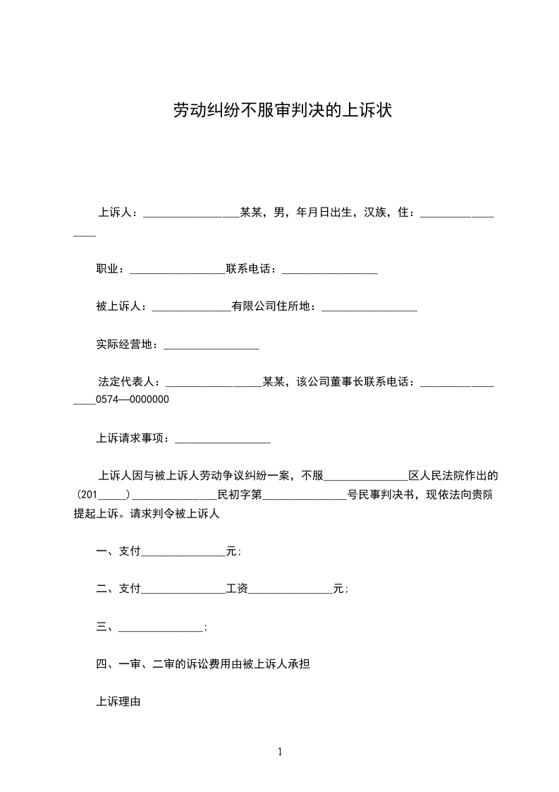 上诉人因与被上诉人劳动争议纠纷一案,不服_______________区人民法院作出的(201_____)_______________民初字第_______________号民事判决书,现依法向贵院提起上诉。请求判令被上诉人
