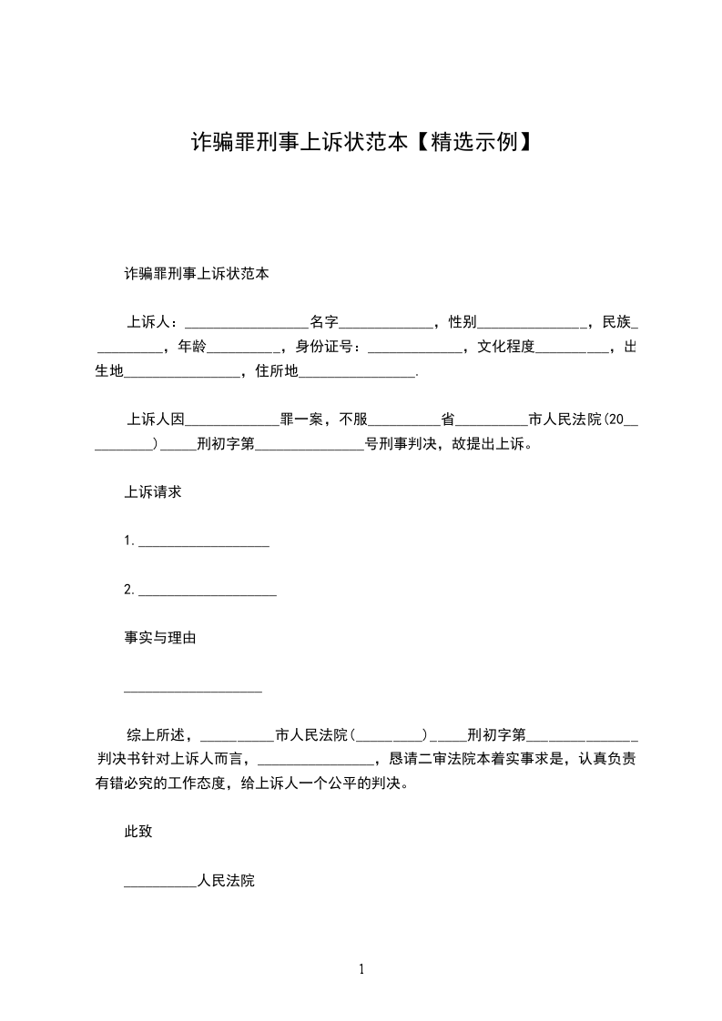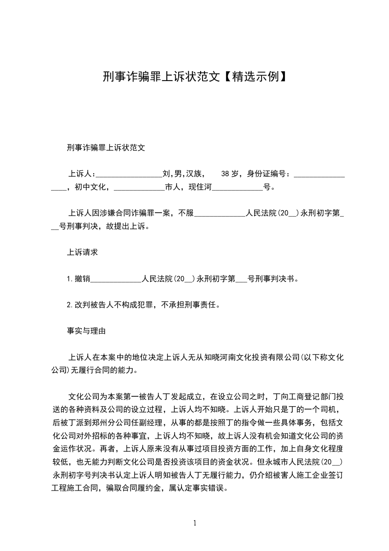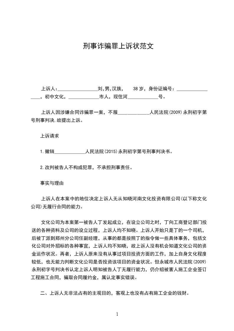 上诉人因涉嫌合同诈骗罪一案,不服_____________人民法院(2009)永刑初字第号刑事判决,故提出上诉。