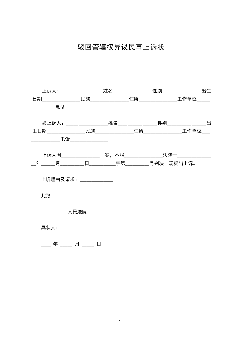上诉人:_________________姓名________________性别________________出生日期________________民族________________住所________________工作单位________________电话________________
