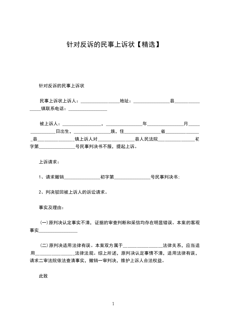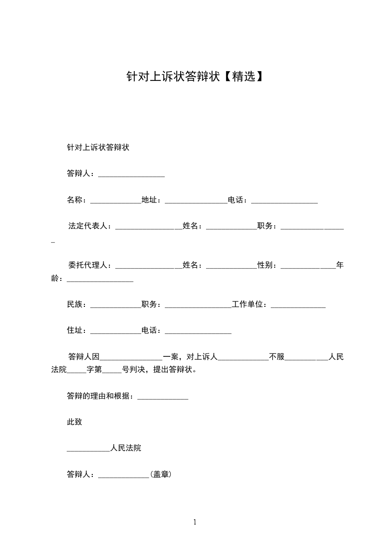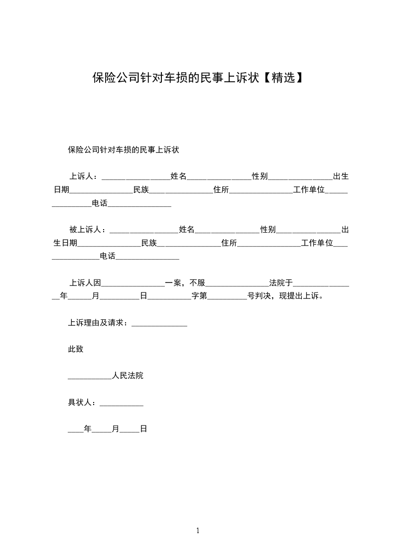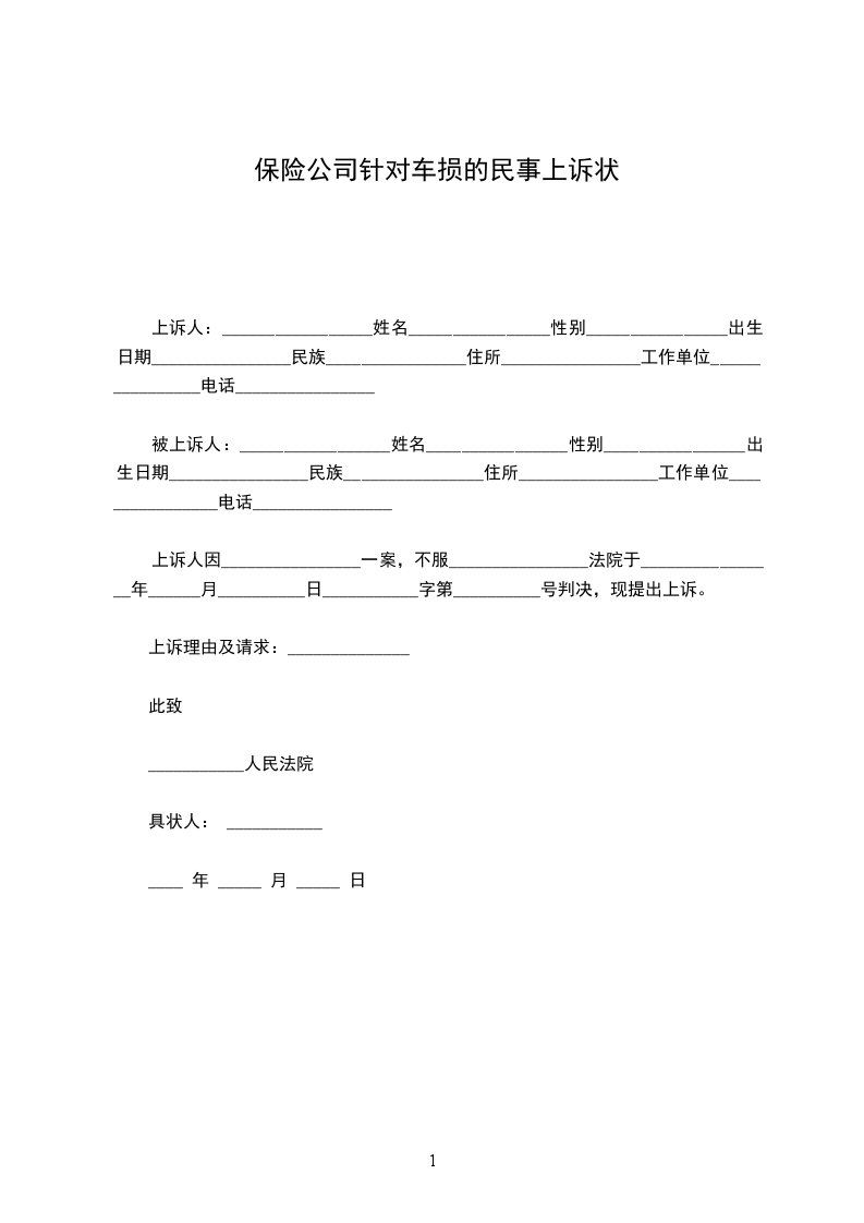 上诉人:_________________姓名________________性别________________出生日期________________民族________________住所________________工作单位________________电话________________