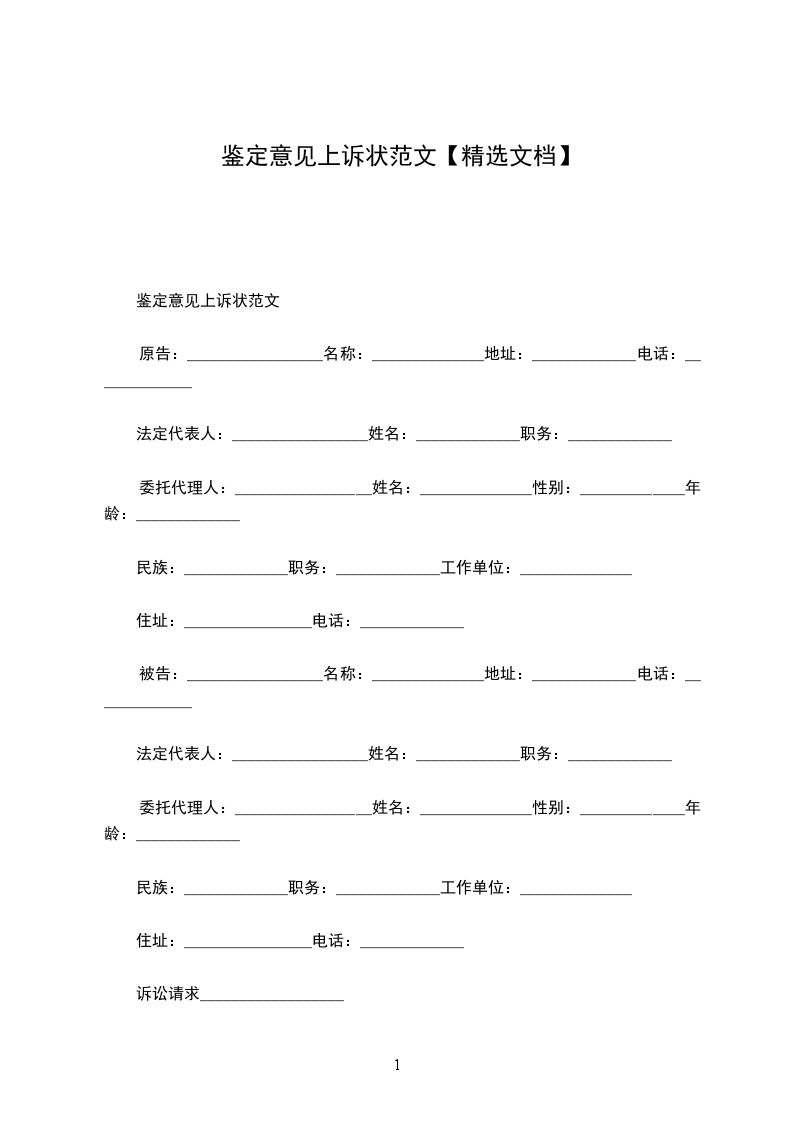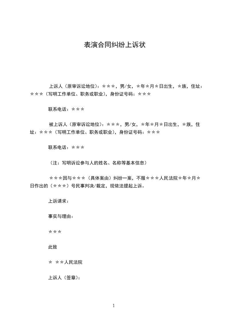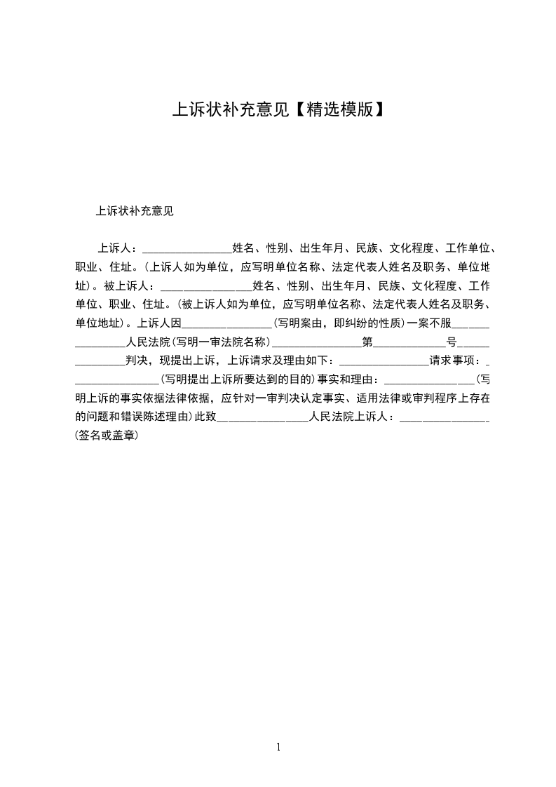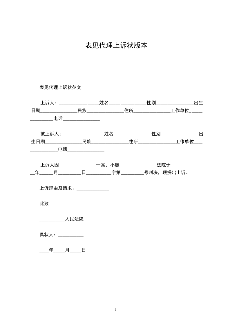 上诉人:_________________姓名________________性别________________出生日期________________民族________________住所________________工作单位________________电话________________