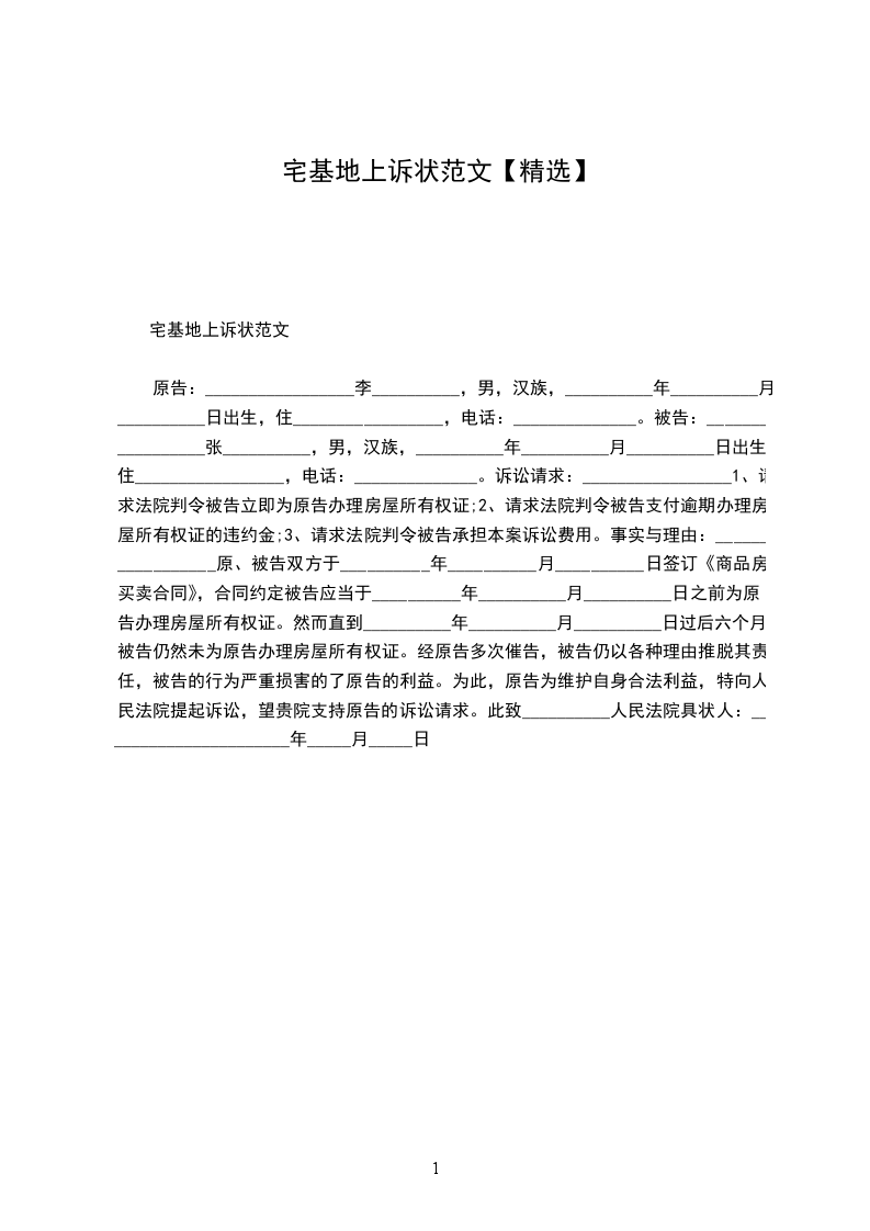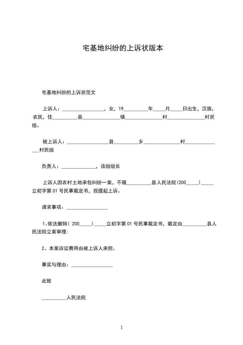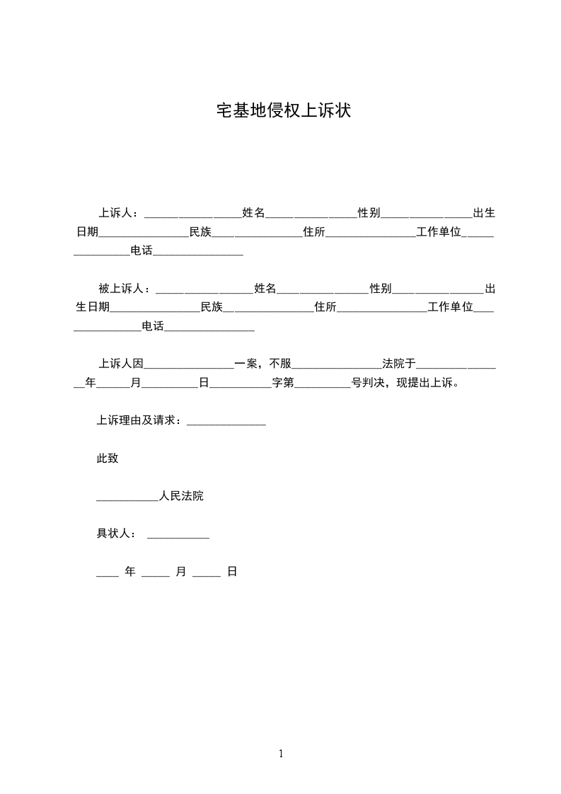 上诉人:_________________姓名________________性别________________出生日期________________民族________________住所________________工作单位________________电话________________