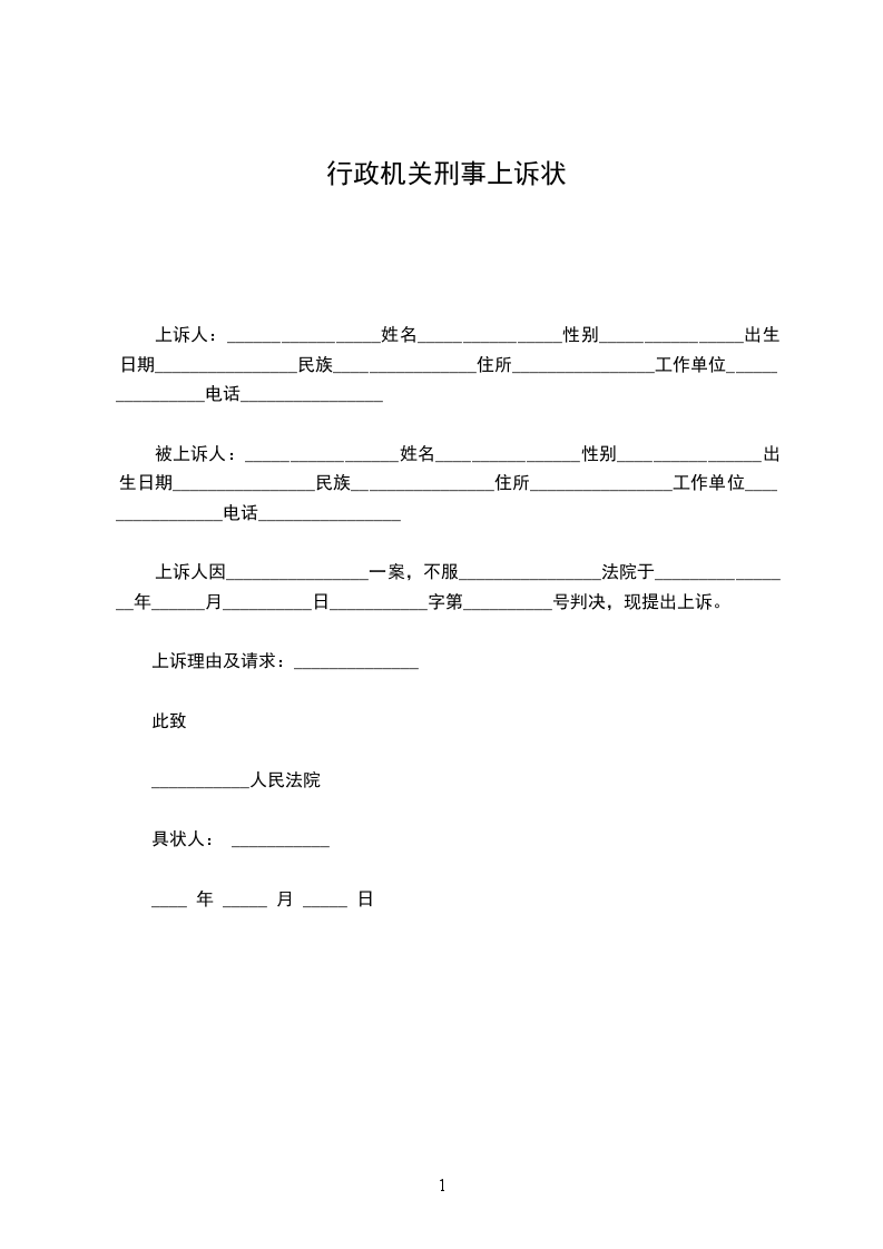 上诉人:_________________姓名________________性别________________出生日期________________民族________________住所________________工作单位________________电话________________