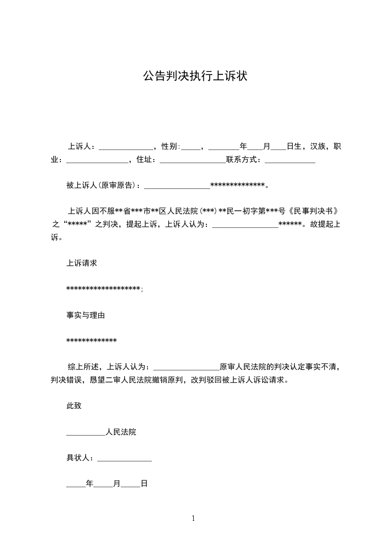 上诉人:______________,性别:_____,________年____月____日生,汉族,职业:________________,住址:_________________联系方式:_____________