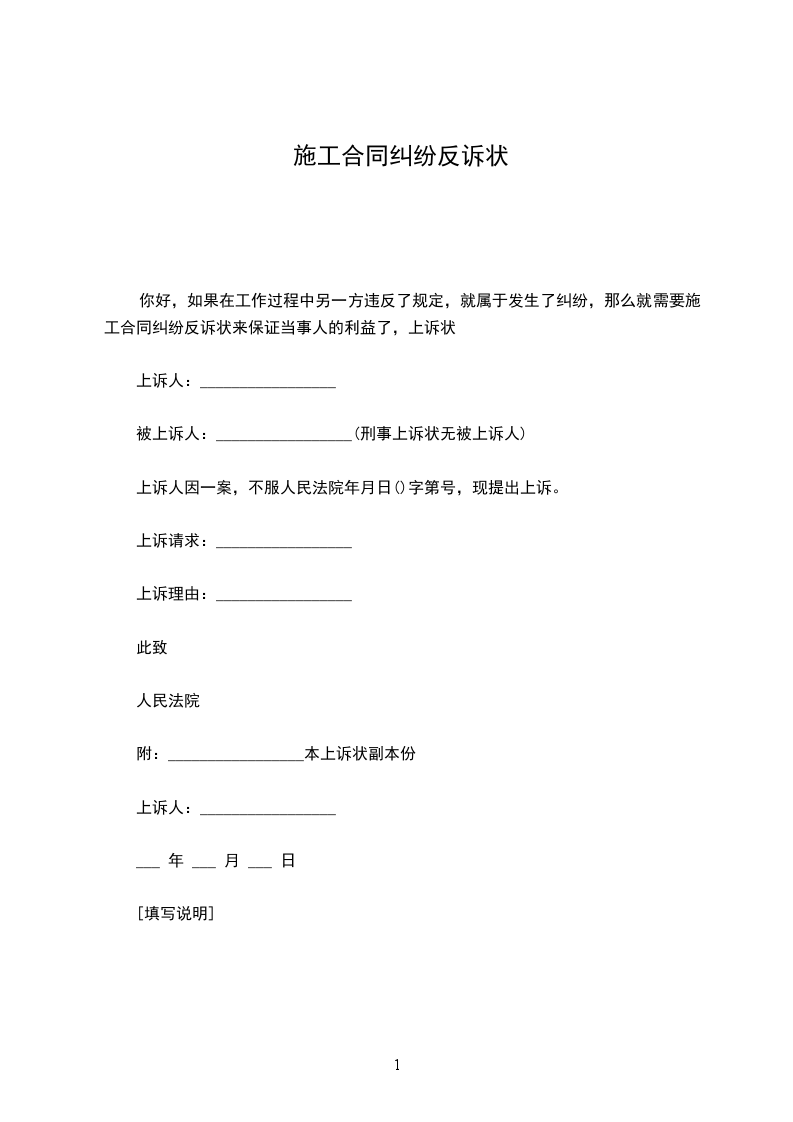 你好,如果在工作过程中另一方违反了规定,就属于发生了纠纷,那么就需要施工合同纠纷反诉状来保证当事人的利益了,上诉状
