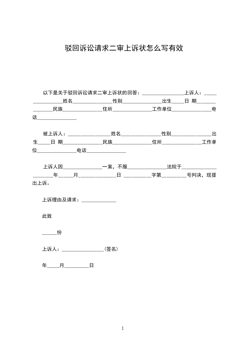 以下是关于驳回诉讼请求二审上诉状的回答:_________________上诉人:_________________姓名________________性别________________出生日期________________民族________________住所________________工作单位________________电话________________