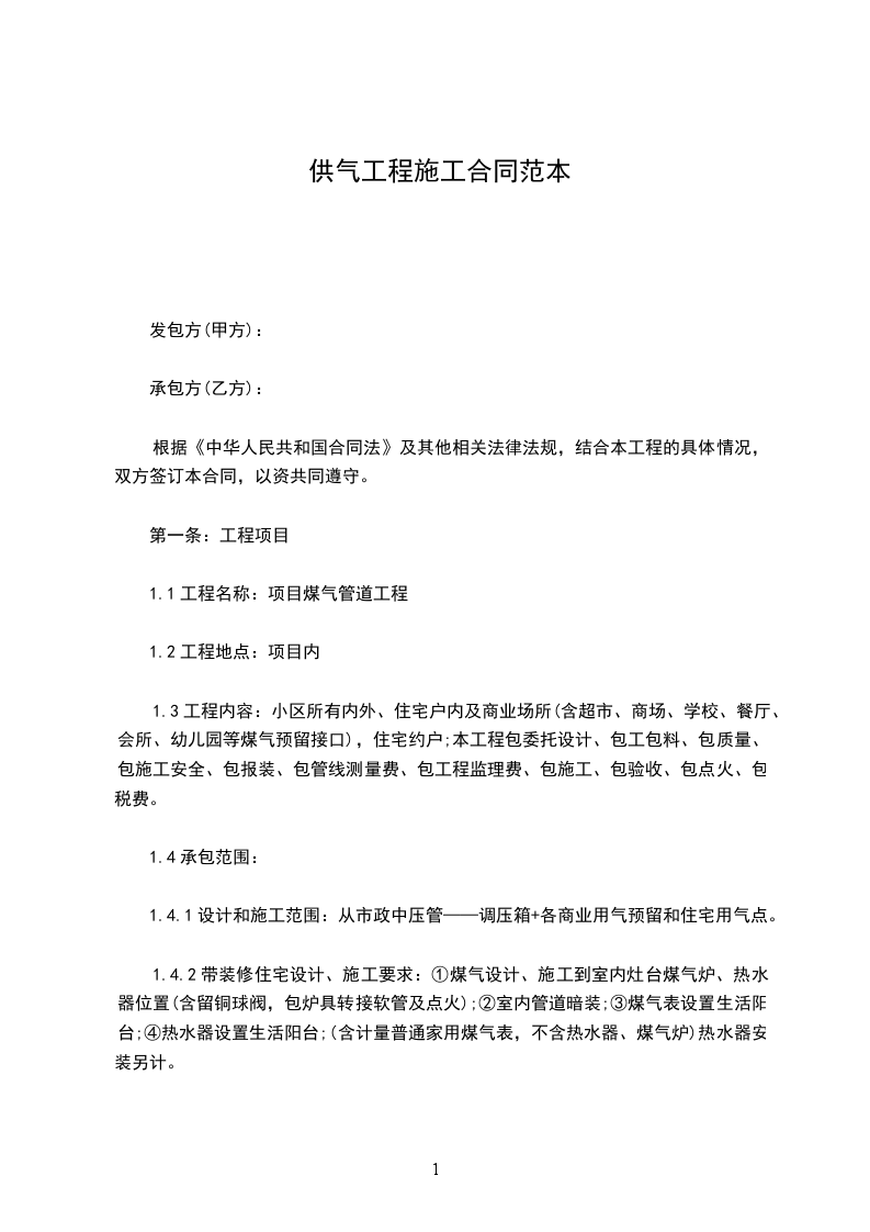 1.6承包方式:包设计费、包工包料、包质量、包施工安全、包税费、包工程验收、包点火、包工程监理费。以普通住宅,毛坯房一户两个热源点元/户包干;精装修,豪宅做暗埋管每户增加元;竣工后,清点户数按实结算;商业部分预留管道,费用由乙方垫资敷设,待结算后由使用者将该费用另行支付给乙方。