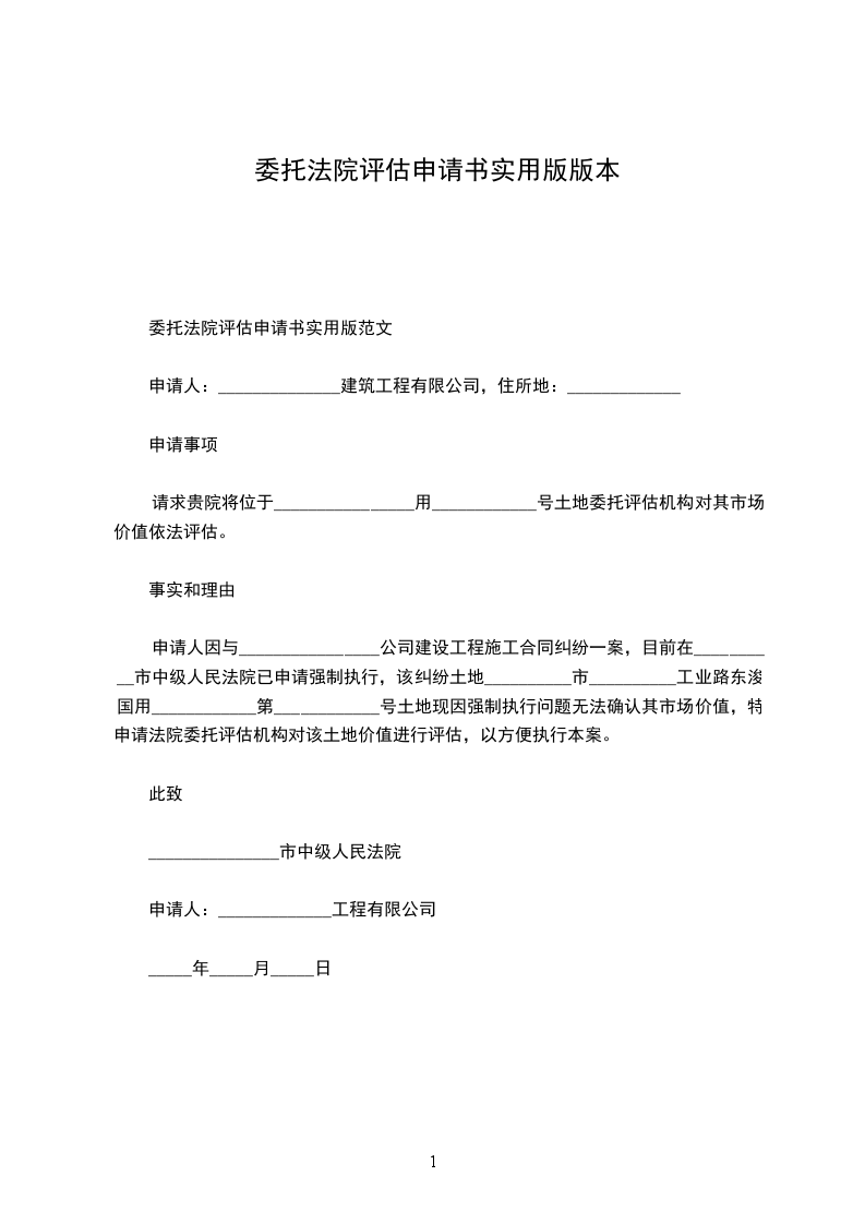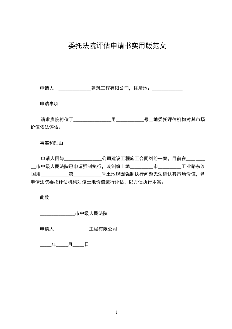 申请人因与________________公司建设工程施工合同纠纷一案,目前在__________市中级人民法院已申请强制执行,该纠纷土地__________市__________工业路东浚国用 ____________ 第 ____________ 号土地现因强制执行问题无法确认其市场价值,特申请法院委托评估机构对该土地价值进行评估,以方便执行本案。