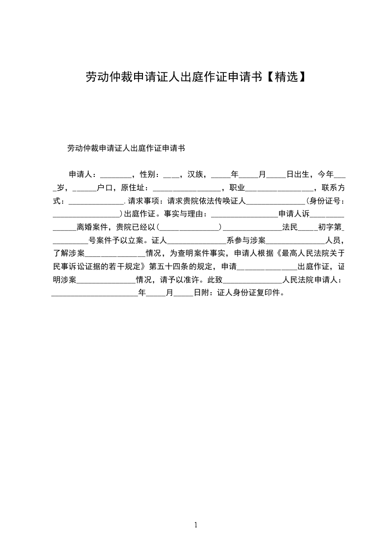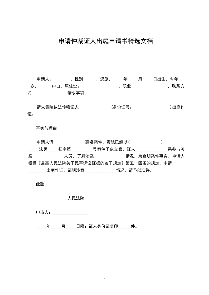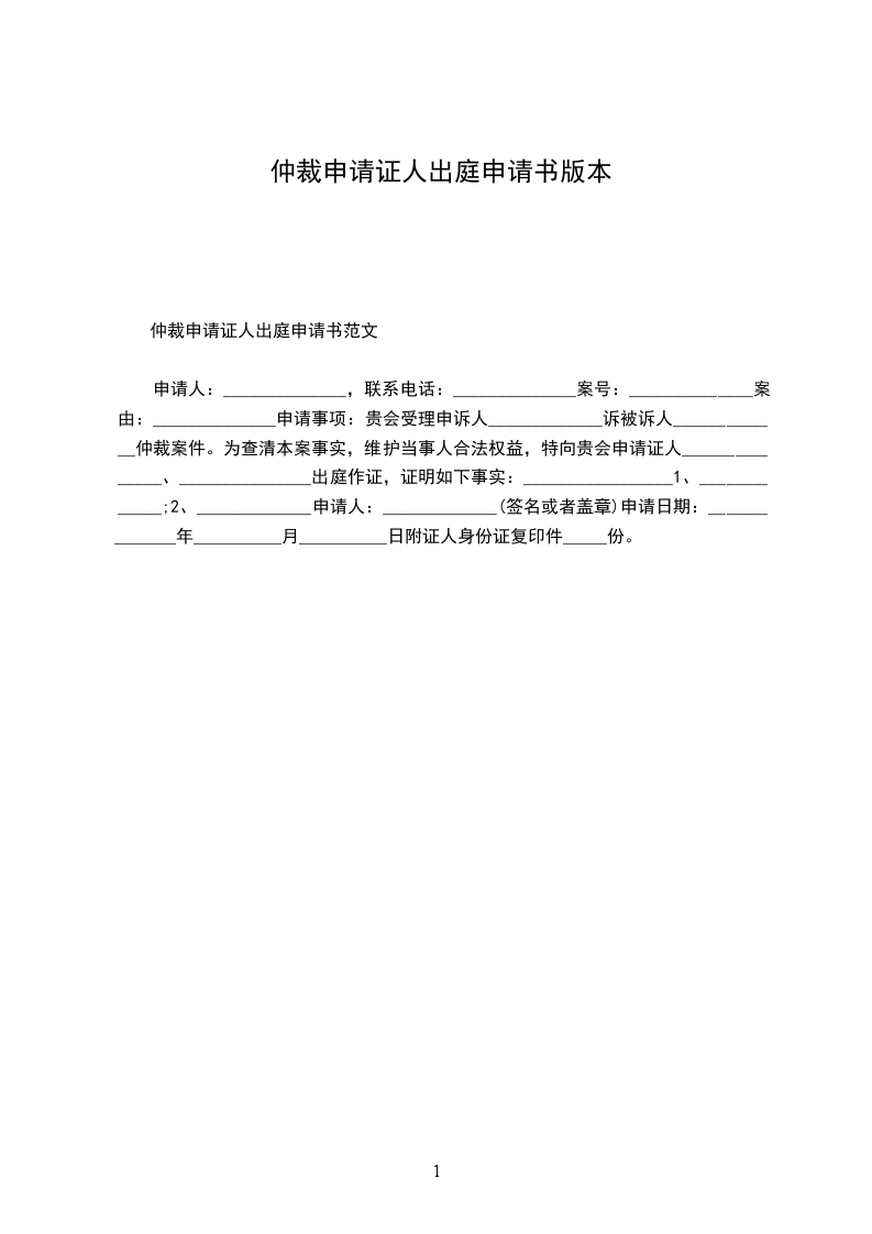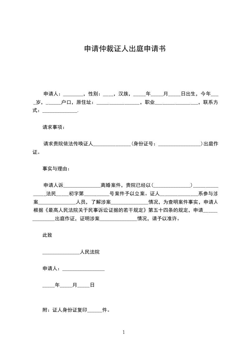 申请人:______________,联系电话:______________ 案号:______________ 案由:______________ 申请事项: 贵会受理申诉人_____________诉被诉人_____________仲裁案件。为查清本案事实,维护当事人合法权益,特向贵会申请证人_______________、_______________出庭作证,证明如下事实:_________________ 1、_____________; 2、_____________ 申请人:_____________(签名或者盖章) 申请日期:______________年__________月__________日 附证人身份证复印件_____份。