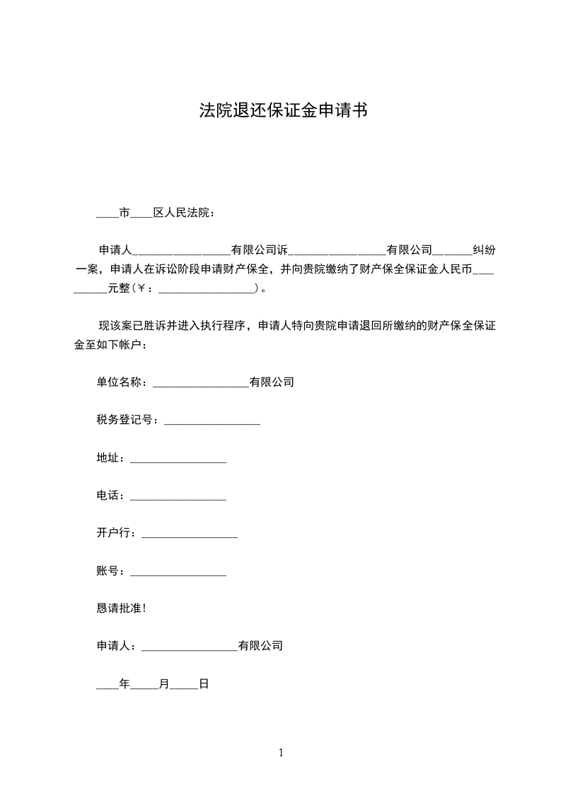 申请人_________________有限公司诉_________________有限公司_______纠纷一案,申请人在诉讼阶段申请财产保全,并向贵院缴纳了财产保全保证金人民币__________元整(¥:_________________)。
