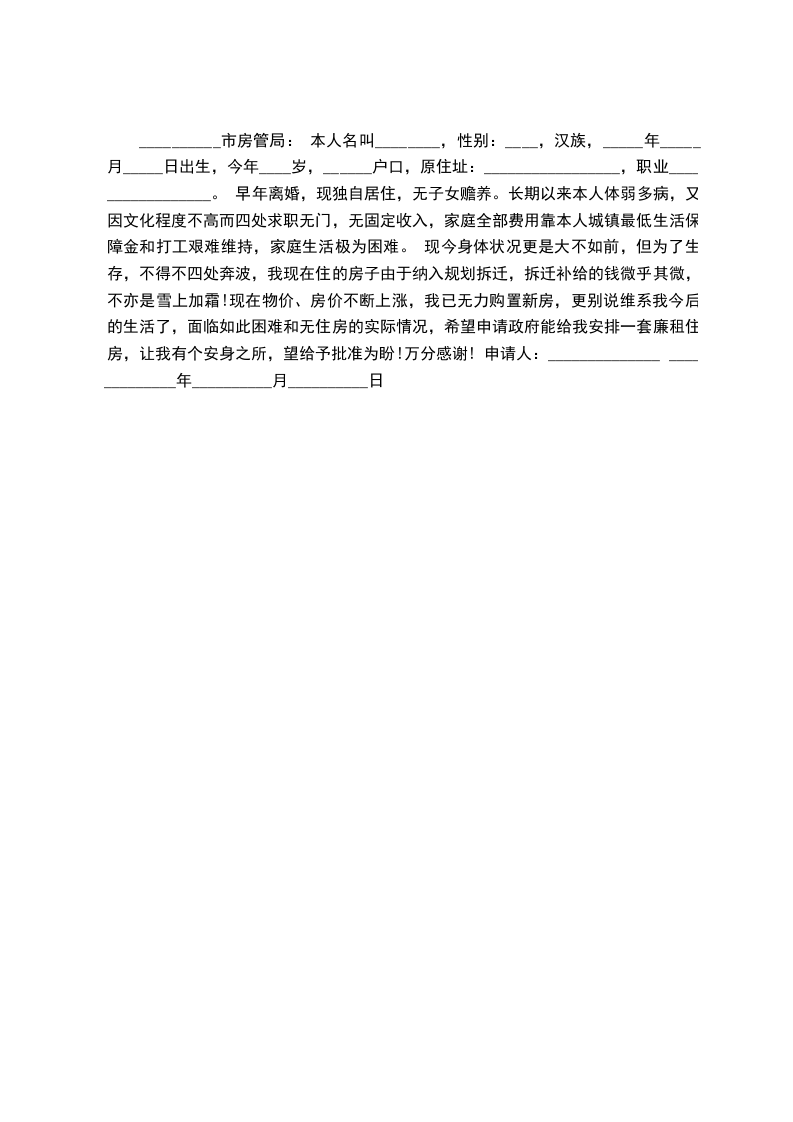 __________市房管局: 本人名叫________,性别:____,汉族,_____年_____月_____日出生,今年____岁,______户口,原住址:_________________,职业_________________。 早年离婚,现独自居住,无子女赡养。长期以来本人体弱多病,又因文化程度不高而四处求职无门,无固定收入,家庭全部费用靠本人城镇最低生活保障金和打工艰难维持,家庭生活极为困难。 现今身体状况更是大不如前,但为了生存,不得不四处奔波,我现在住的房子由于纳入规划拆迁,拆迁补给的钱微乎其微,不亦是雪上加霜!现在物价、房价不断上涨,我已无力购置新房,更别说维系我今后的生活了,面临如此困难和无住房的实际情况,希望申请政府能给我安排一套廉租住房,让我有个安身之所,望给予批准为盼!万分感谢! 申请人:______________ _____________年__________月__________日