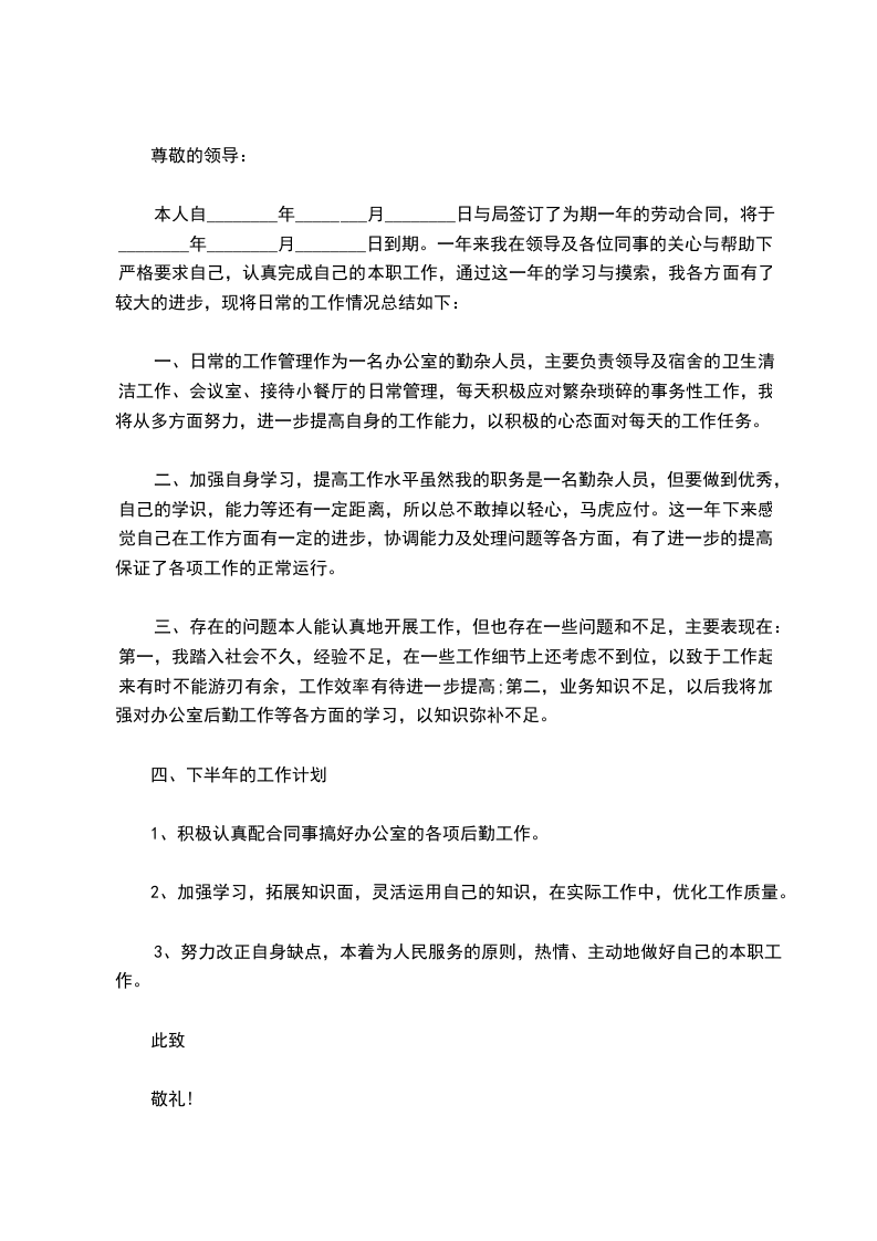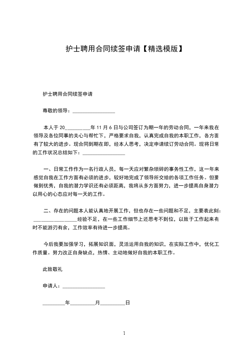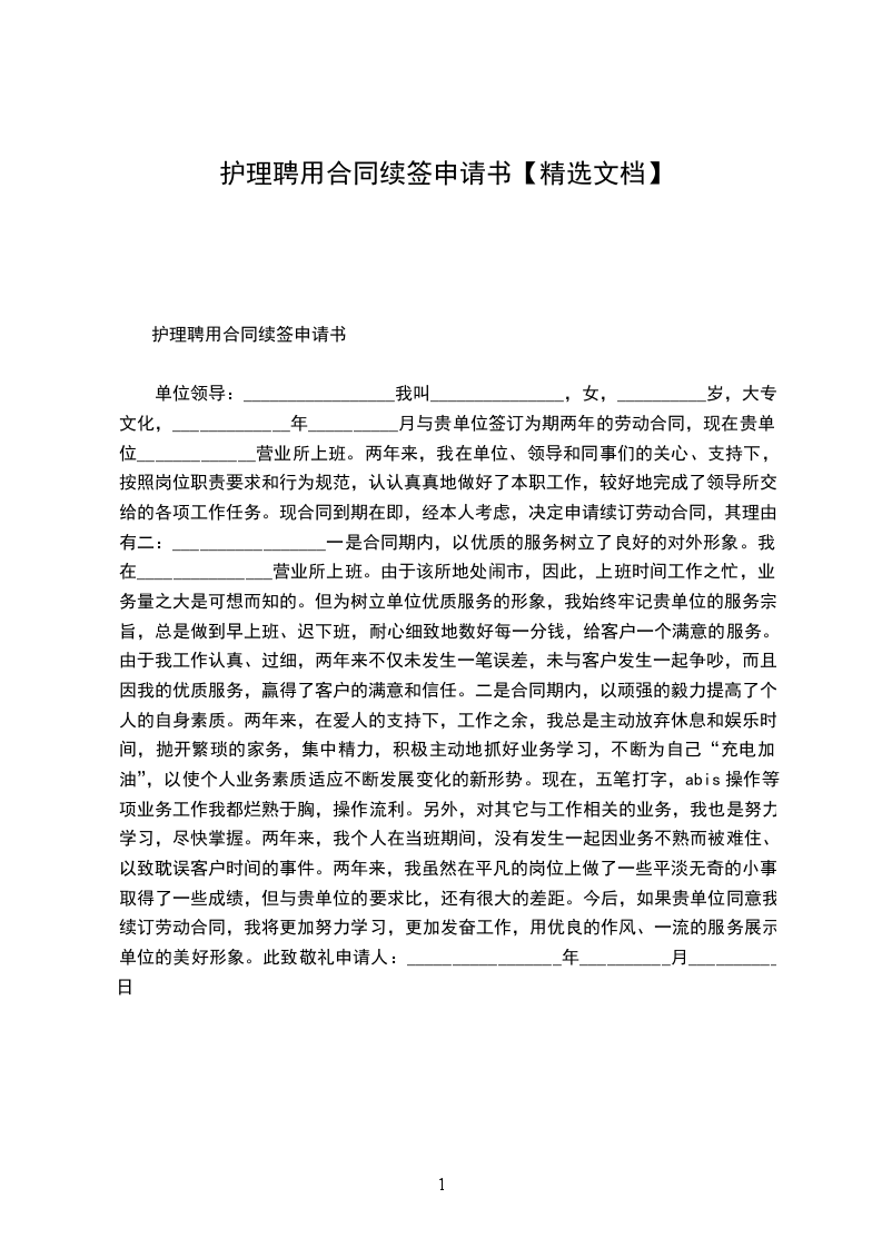 单位领导:_________________ 我叫_______________,女,__________岁,大专文化,_____________年__________月与贵单位签订为期两年的劳动合同,现在贵单位_____________营业所上班。两年来,我在单位、领导和同事们的关心、支持下,按照岗位职责要求和行为规范,认认真真地做好了本职工作,较好地完成了领导所交给的各项工作任务。现合同到期在即,经本人考虑,决定申请续订劳动合同,其理由有二:_________________ 一是合同期内,以优质的服务树立了良好的对外形象。我在_______________营业所上班。由于该所地处闹市,因此,上班时间工作之忙,业务量之大是可想而知的。但为树立单位优质服务的形象,我始终牢记贵单位的服务宗旨,总是做到早上班、迟下班,耐心细致地数好每一分钱,给客户一个满意的服务。由于我工作认真、过细,两年来不仅未发生一笔误差,未与客户发生一起争吵,而且因我的优质服务,赢得了客户的满意和信任。 二是合同期内,以顽强的毅力提高了个人的自身素质。两年来,在爱人的支持下,工作之余,我总是主动放弃休息和娱乐时间,抛开繁琐的家务,集中精力,积极主动地抓好业务学习,不断为自己“充电加油”,以使个人业务素质适应不断发展变化的新形势。现在,五笔打字,abis操作等项业务工作我都烂熟于胸,操作流利。另外,对其它与工作相关的业务,我也是努力学习,尽快掌握。两年来,我个人在当班期间,没有发生一起因业务不熟而被难住、以致耽误客户时间的事件。 两年来,我虽然在平凡的岗位上做了一些平淡无奇的小事,取得了一些成绩,但与贵单位的要求比,还有很大的差距。今后,如果贵单位同意我续订劳动合同,我将更加努力学习,更加发奋工作,用优良的作风、一流的服务展示单位的美好形象。此致敬礼 申请人:_________________ 年__________月__________日