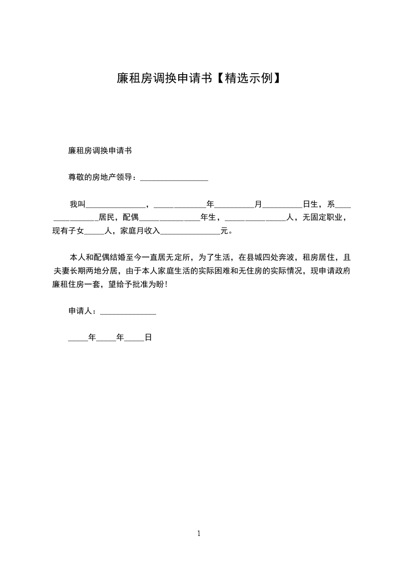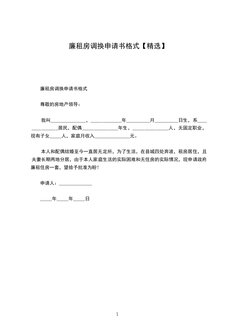 一、申请人姓名:_________________ 二、申请人所在单位:_________________ 三、申请原因:_________________ 四、申请户型:_________________平方米的房型一套, 五、申请楼层:_________________ 申请人:______________ __________年__________月__________日