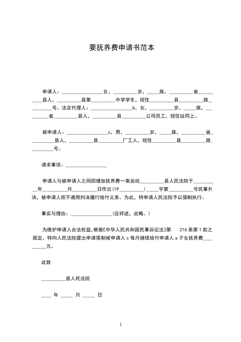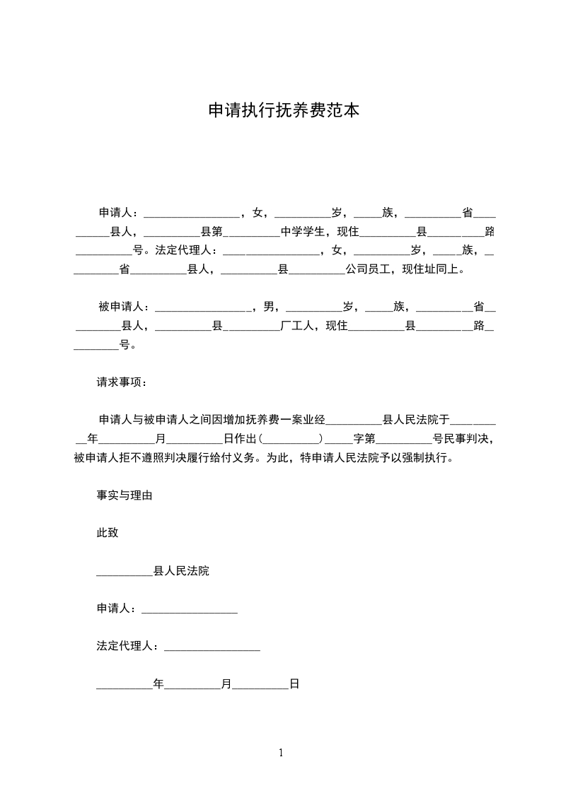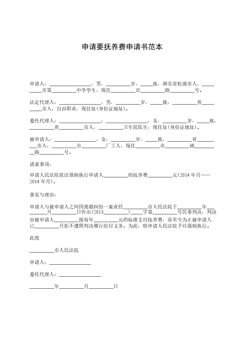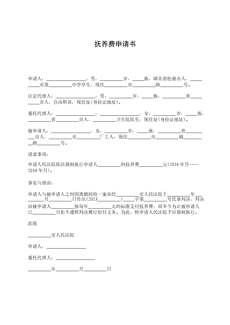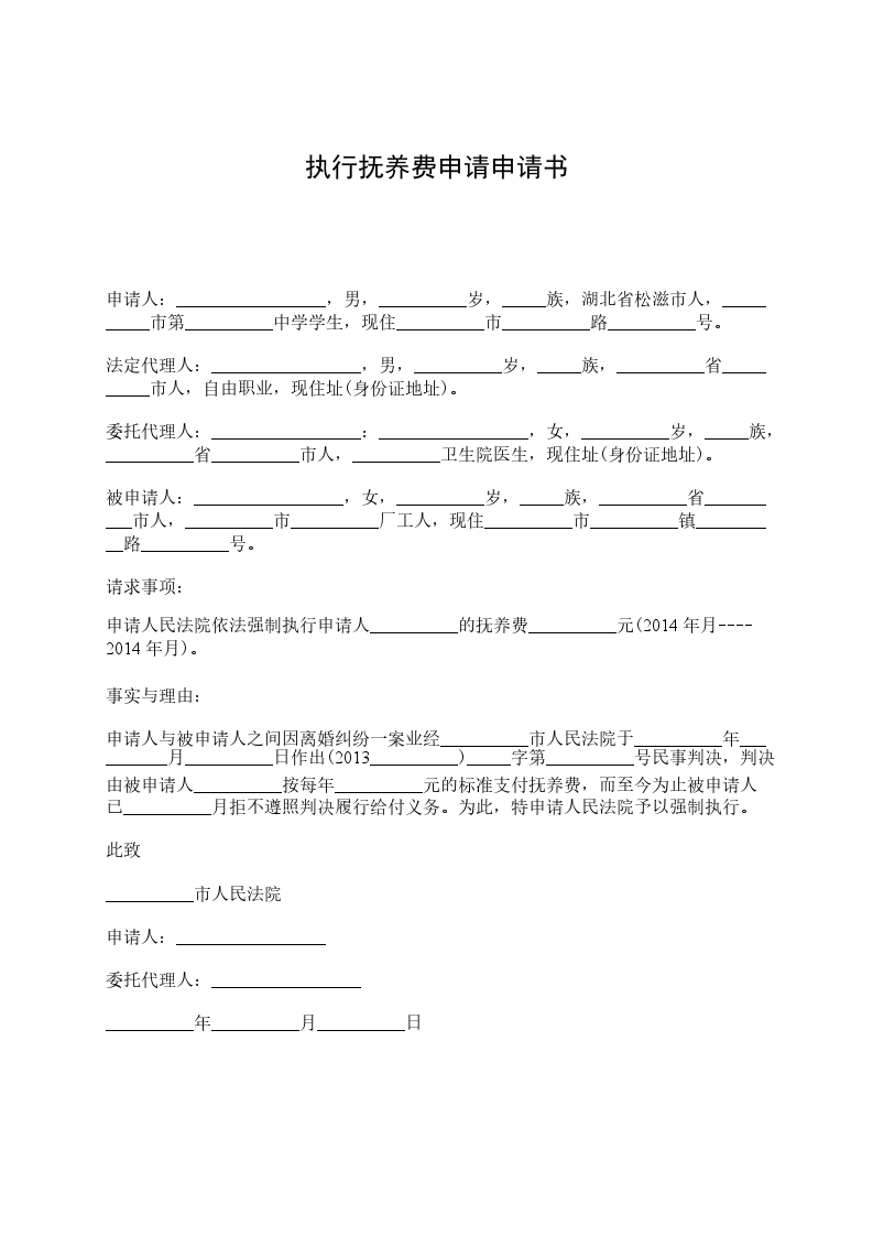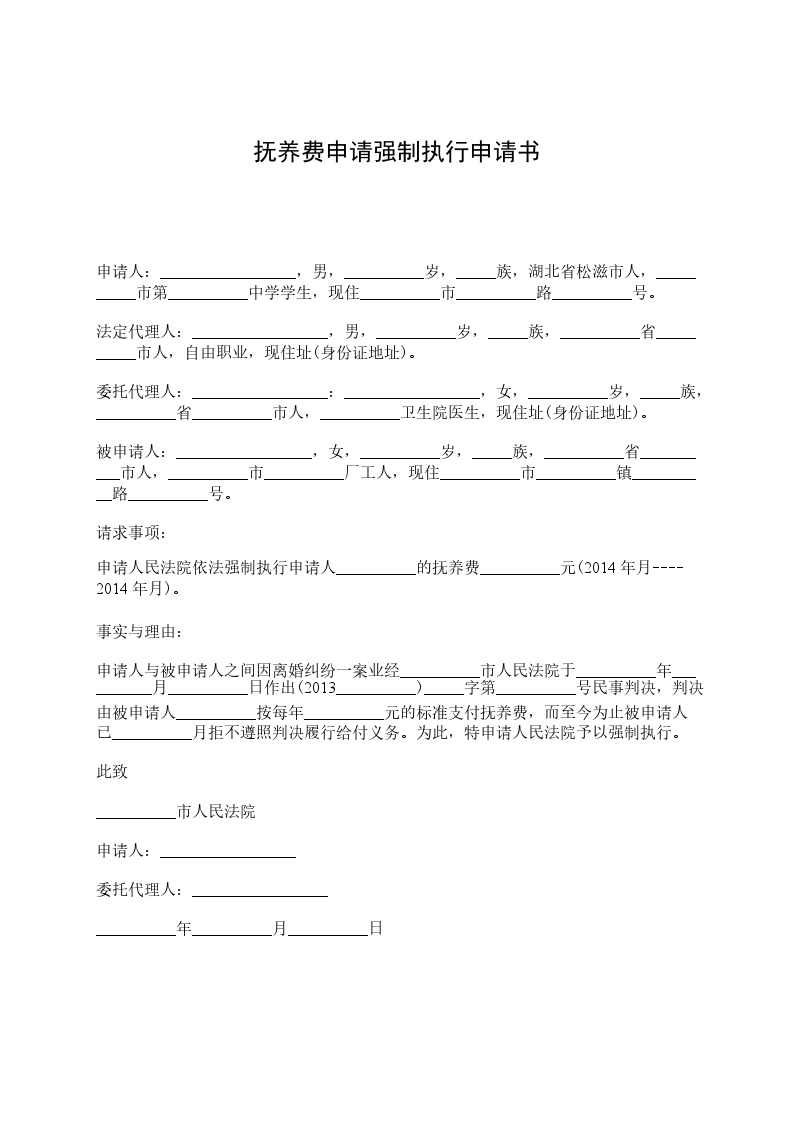 申请人:_________________,男,__________岁,_____族,湖北省松滋市人,__________市第__________中学学生,现住__________市__________路__________号。 法定代理人:_________________,男,__________岁,_____族,__________省__________市人,自由职业,现住址(身份证地址)。 委托代理人:_________________:_________________,女,__________岁,_____族,__________省__________市人,__________卫生院医生,现住址(身份证地址)。 被申请人:_________________,女,__________岁,_____族,__________省__________市人,__________市__________厂工人,现住__________市__________镇__________路__________号。 请求事项: 申请人民法院依法强制执行申请人__________的抚养费__________元(2024年月----2024年月)。 事实与理由: 申请人与被申请人之间因离婚纠纷一案业经__________市人民法院于__________年__________月__________日作出(2024__________)_____字第__________号民事判决,判决由被申请人__________按每年__________元的标准支付抚养费,而至今为止被申请人已__________月拒不遵照判决履行给付义务。为此,特申请人民法院予以强制执行。 此致 __________市人民法院 申请人:_________________ 委托代理人:_________________ __________年__________月__________日