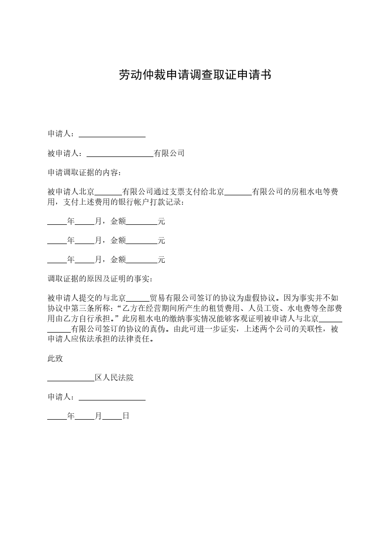 申请人:_________________ 被申请人:_________________有限公司 申请调取证据的内容: 被申请人北京_______有限公司通过支票支付给北京_______有限公司的房租水电等费用,支付上述费用的银行账户打款记录: _____年_____月,金额________元 _____年_____月,金额________元 _____年_____月,金额________元 调取证据的原因及证明的事实: 被申请人提交的与北京______贸易有限公司签订的协议为虚假协议。因为事实并不如协议中第三条所称:“乙方在经营期间所产生的租赁费用、人员工资、水电费等全部费用由乙方自行承担。”此房租水电的缴纳事实情况能够客观证明被申请人与北京____________有限公司签订的协议的真伪。由此可进一步证实,上述两个公司的关联性,被申请人应依法承担的法律责任。 此致 ____________区人民法院 申请人:_________________ _____年_____月_____日