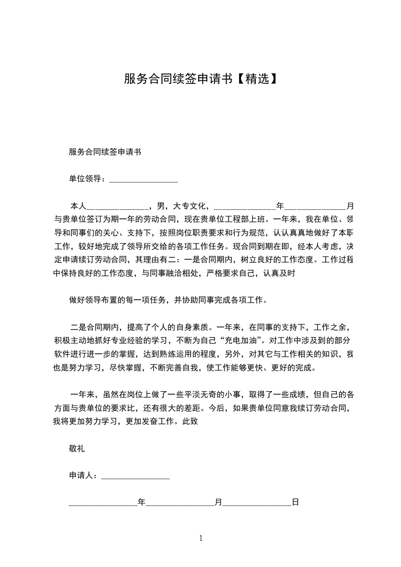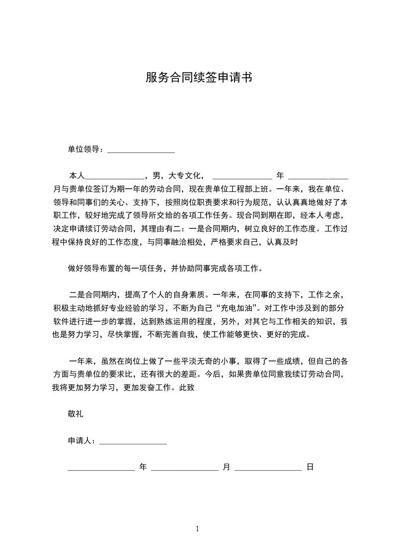 本人_______________,男,大专文化, _______________ 年 _______________ 月与贵单位签订为期一年的劳动合同,现在贵单位工程部上班。一年来,我在单位、领导和同事们的关心、支持下,按照岗位职责要求和行为规范,认认真真地做好了本职工作,较好地完成了领导所交给的各项工作任务。现合同到期在即,经本人考虑,决定申请续订劳动合同,其理由有二:一是合同期内,树立良好的工作态度。工作过程中保持良好的工作态度,与同事融洽相处,严格要求自己,认真及时