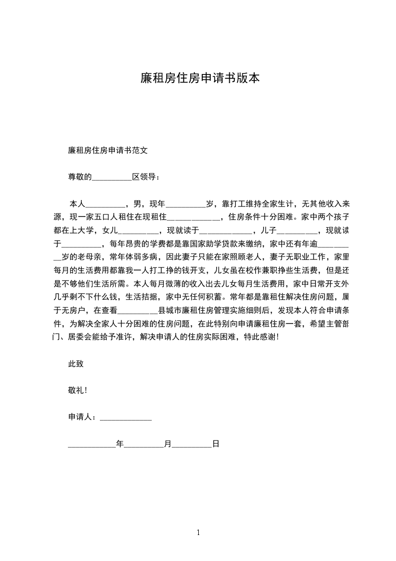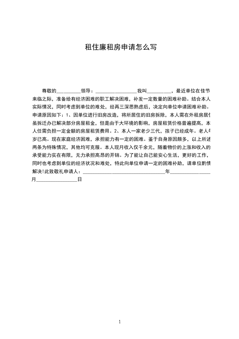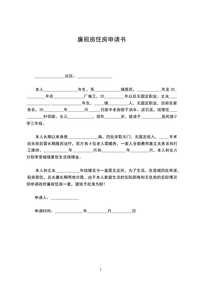 本人和丈夫____________年结婚至今一直居无定所,为了生活,在县城四处奔波,租房居住,且夫妻长期两地分居,由于本人家庭生活的实际困难和无住房的实际情况,现申请政府廉租住房一套,望给予批准为盼!